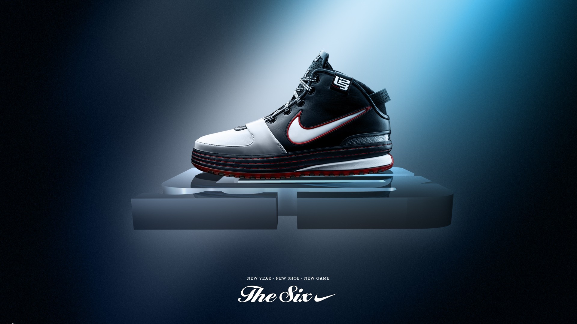 Description: A pair of shoes is displayed on a pedestal with a light shining in the background and a blue light behind it.