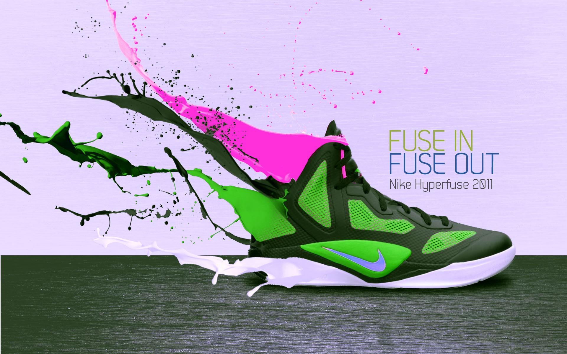 Description: A pair of shoes with a splash of paint on the ground and a purple background with a green and pink shoe.