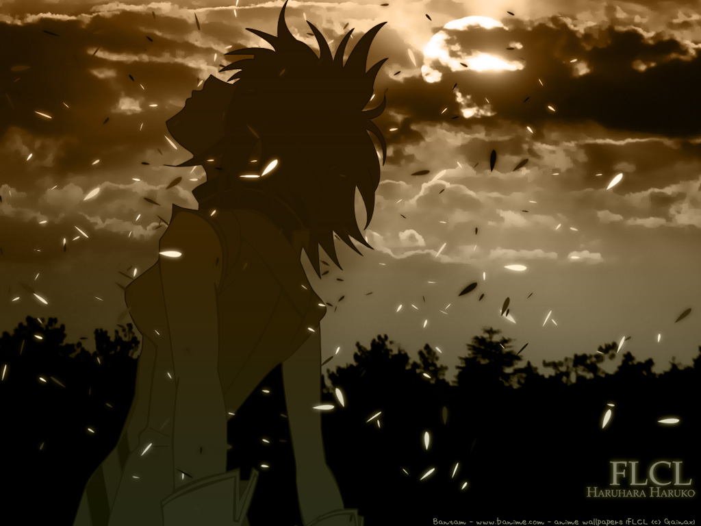 Description: A silhouette of a person with a hairdow and a sky background with birds flying around them and a sun in the distance.