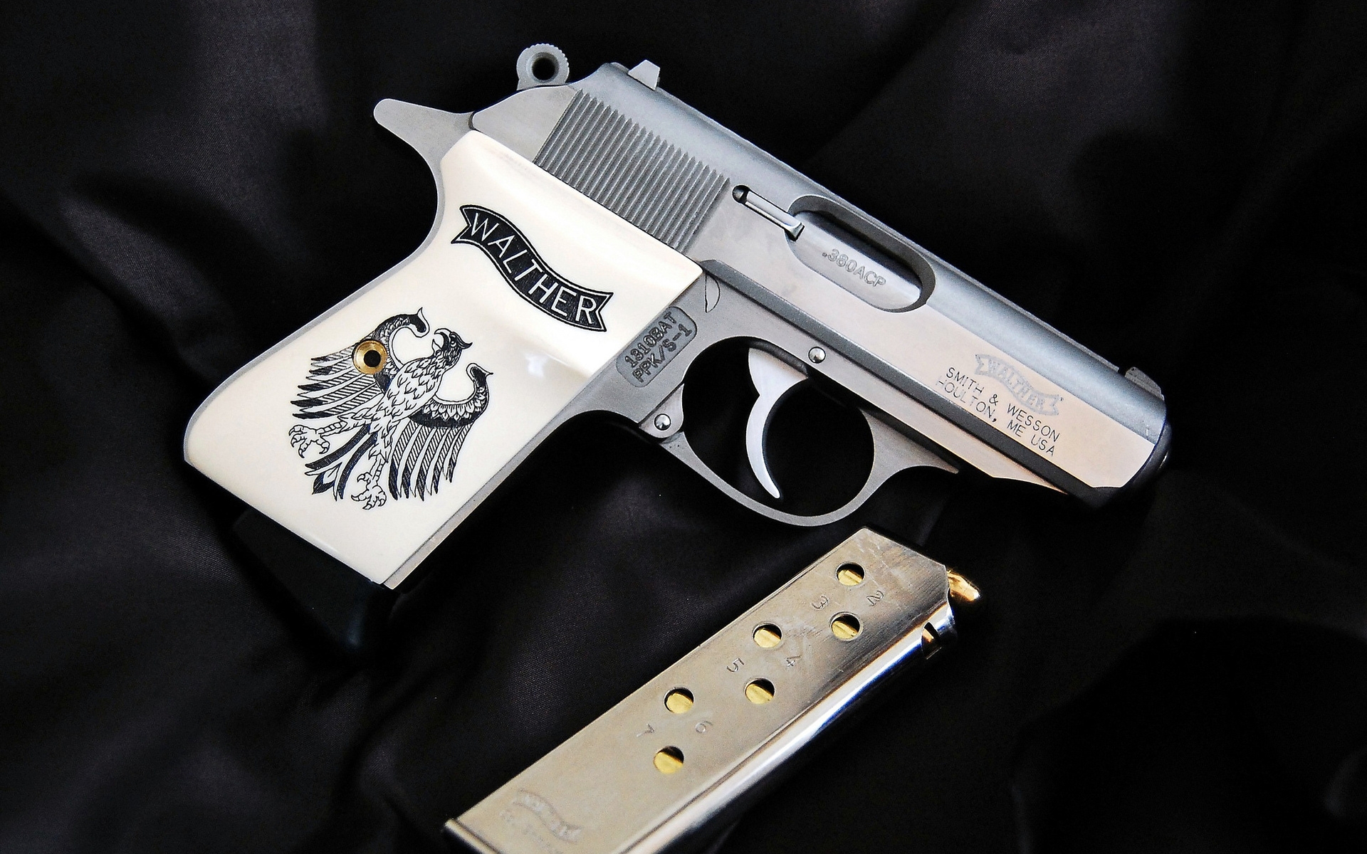 Description: A silver and black gun with a white and black design on it and a knife on a black background.