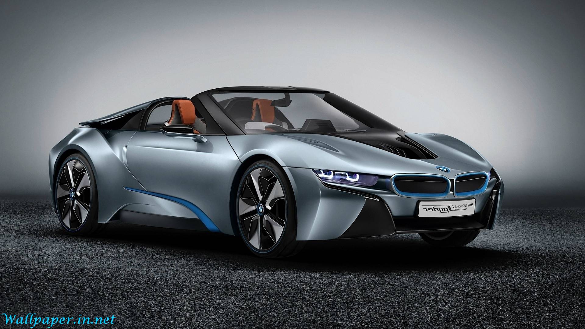 Description: A silver and blue bmw concept car is shown in a studio photo with a gray background and a black floor.