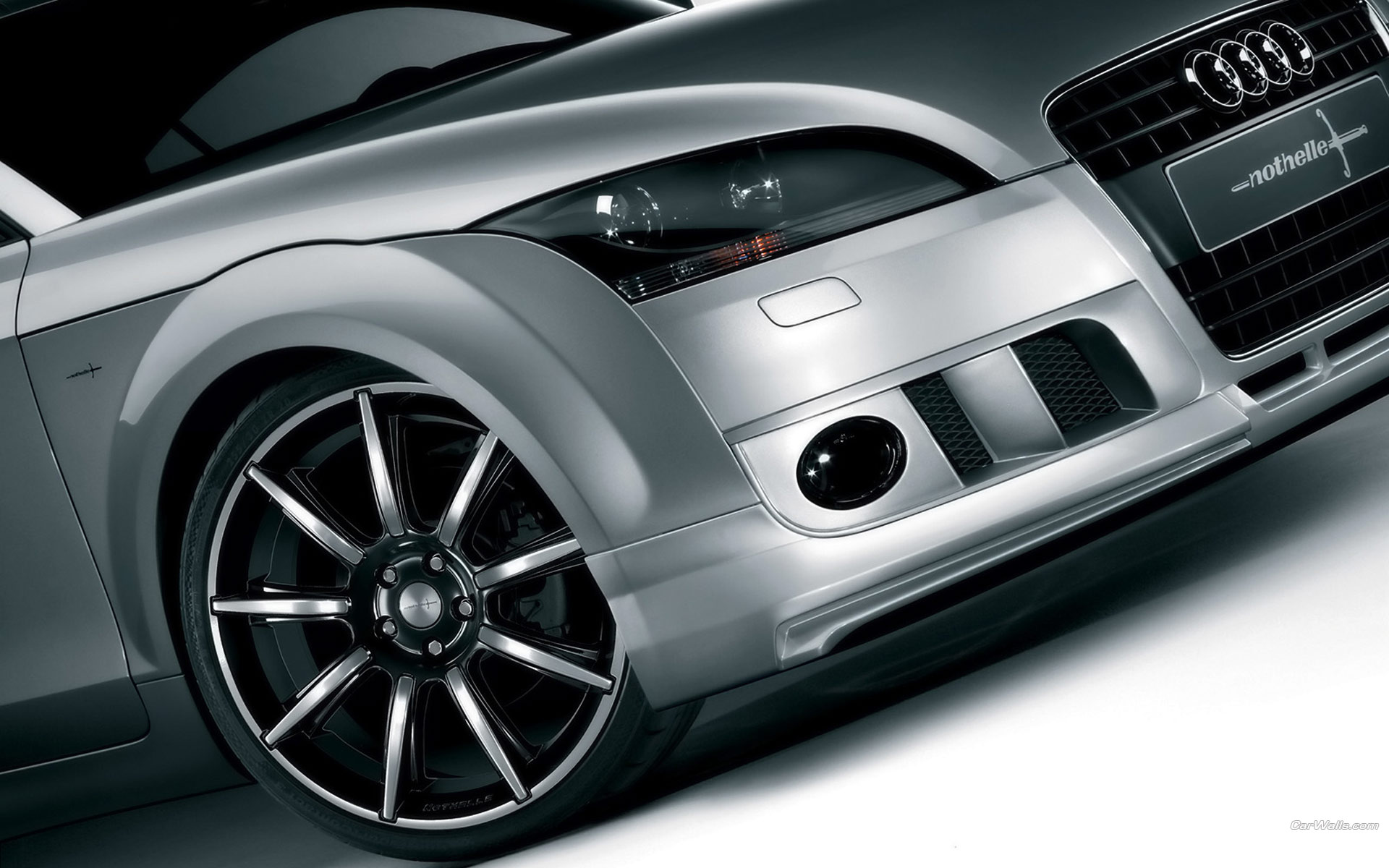Description: A silver car with a black hood and chrome rims on it's front end and a white background.