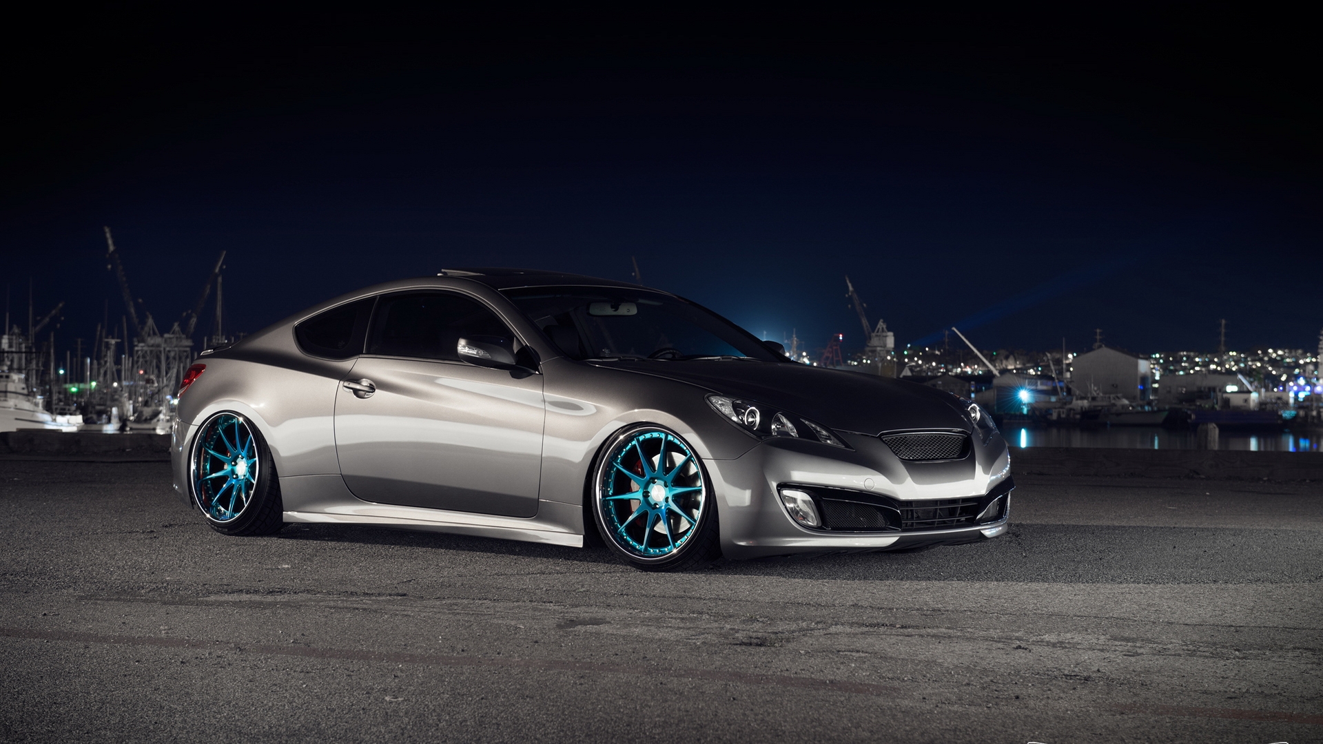 Description: A silver car with blue wheels parked in a parking lot at night with a city skyline in the background.