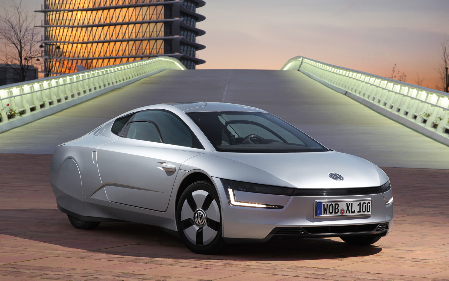 Description: A silver car parked on a brick road near a bridge and a building with a light on it's side.