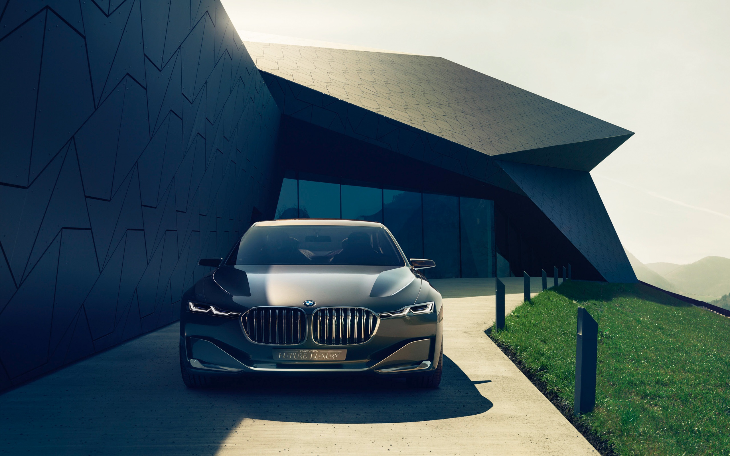 Description: A silver car parked in front of a building with a black roof and a grassy area next to it.