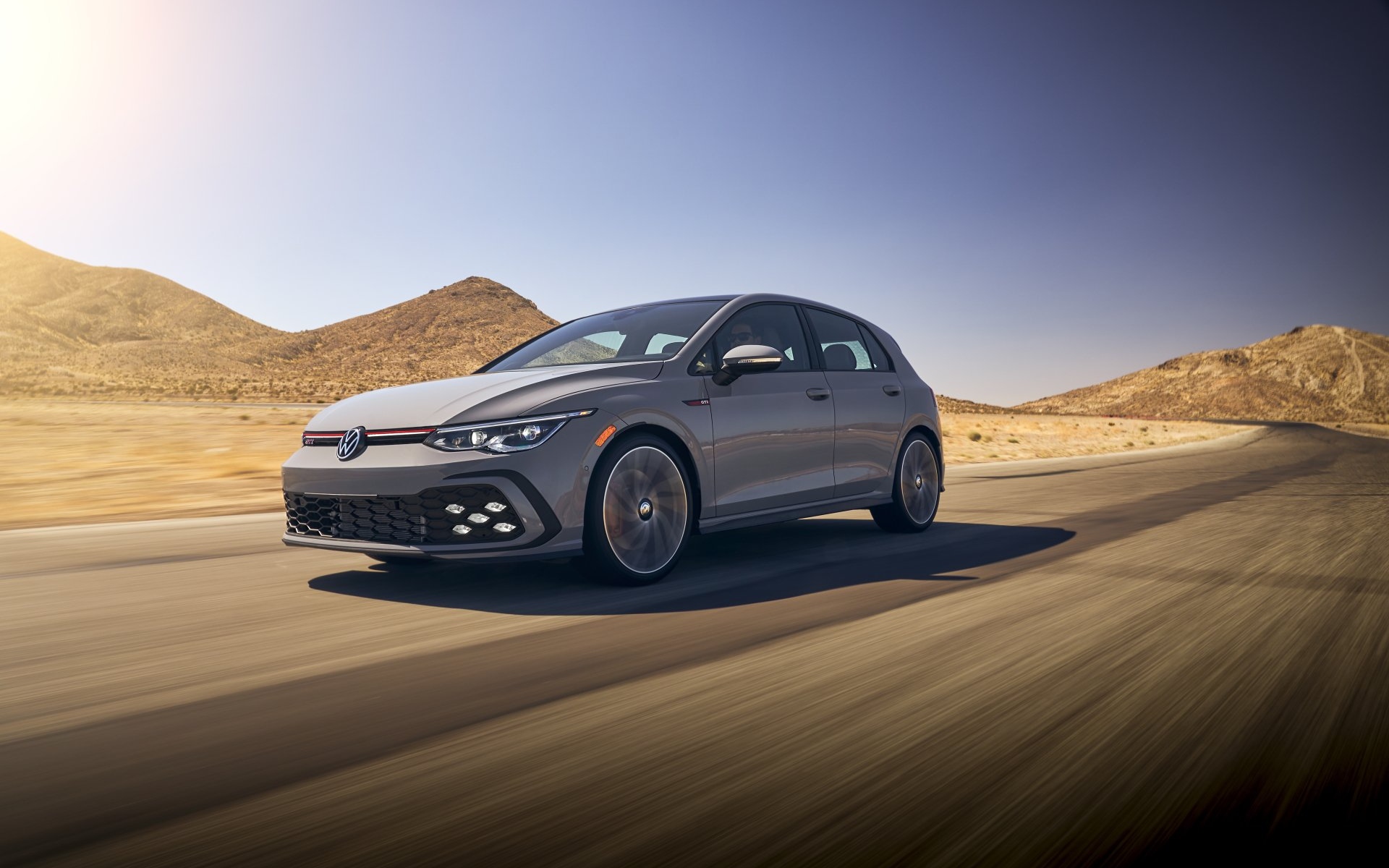 Description: A silver car driving down a road in the desert with mountains in the background and a blue sky above.