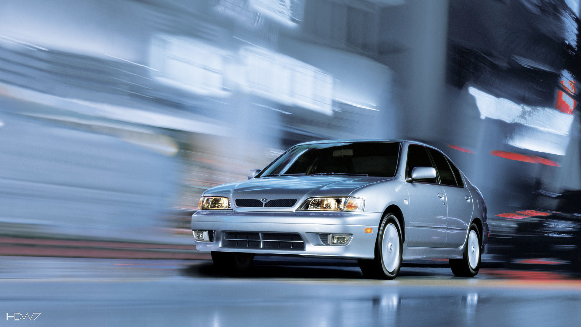 Description: A silver car driving down a street next to tall buildings and a tall building with a clock on it.