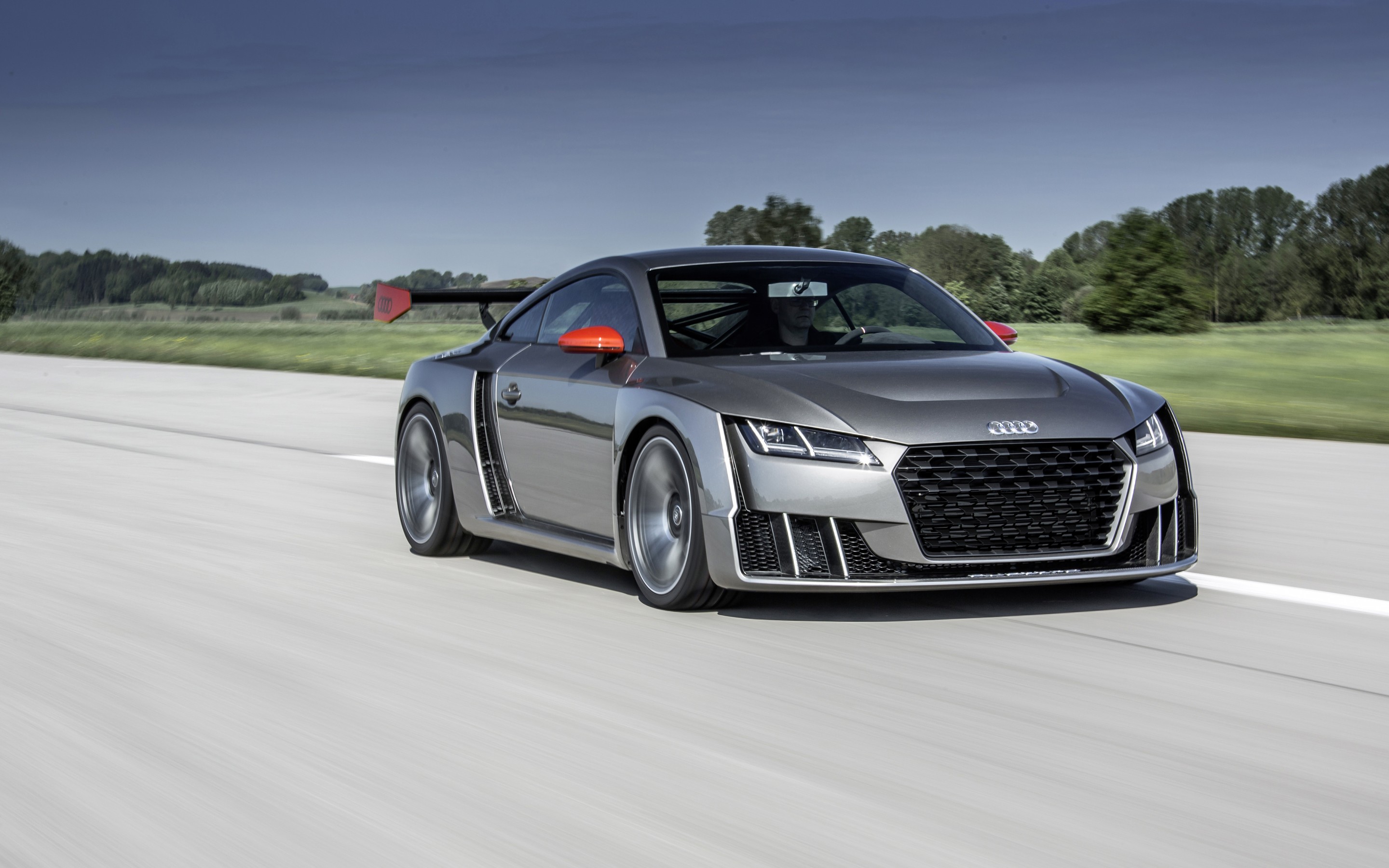 Description: A silver car driving down a road next to a forest and grass covered field with trees in the background.
