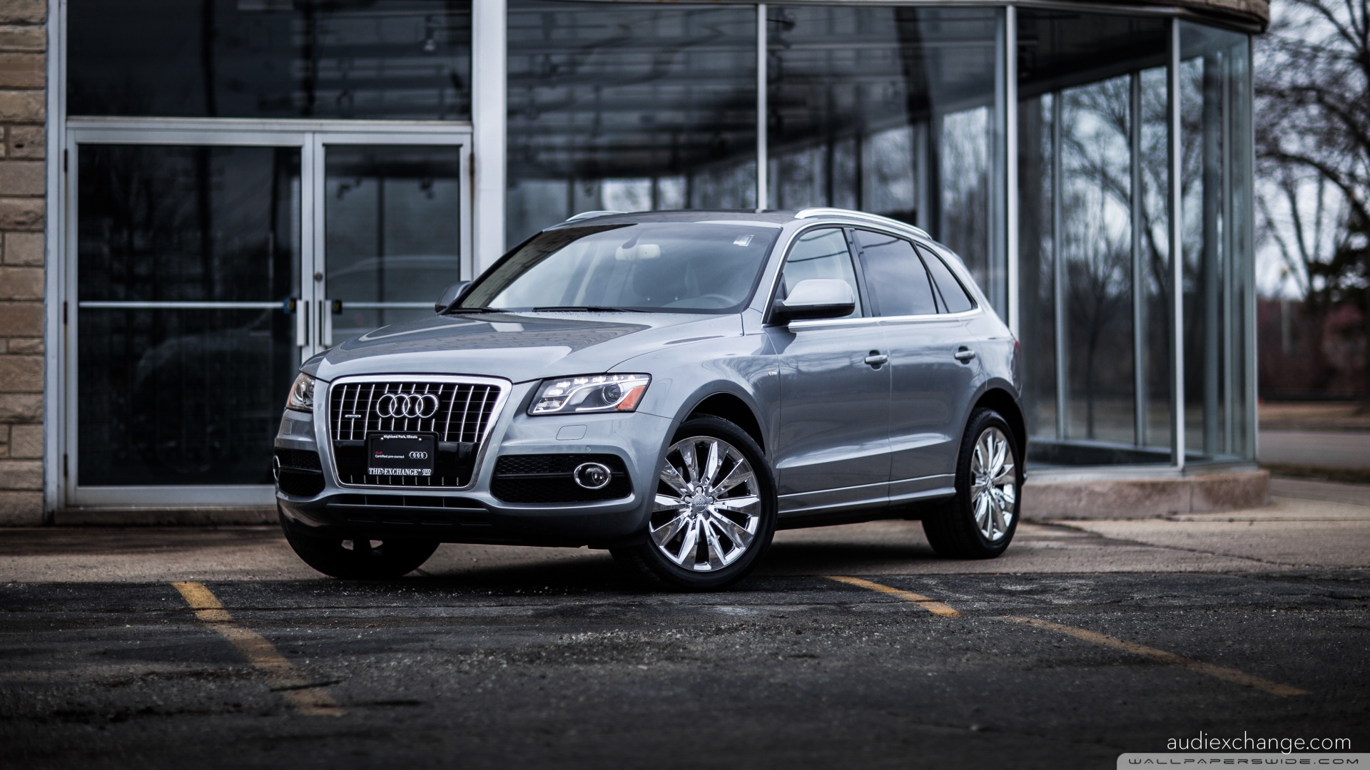 Description: A silver car parked in front of a building with glass doors and windows on the side of the building.
