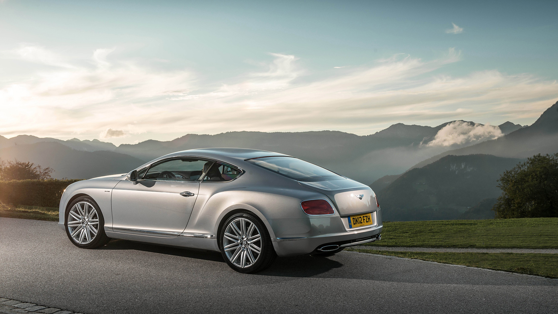 Description: A silver car parked on the side of a road near mountains and clouds in the sky with the sun shining on the top.