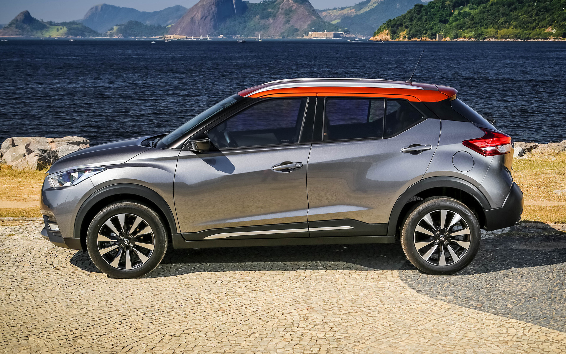 Description: A silver car parked on the side of a road near the water and mountains in the background with a red roof.