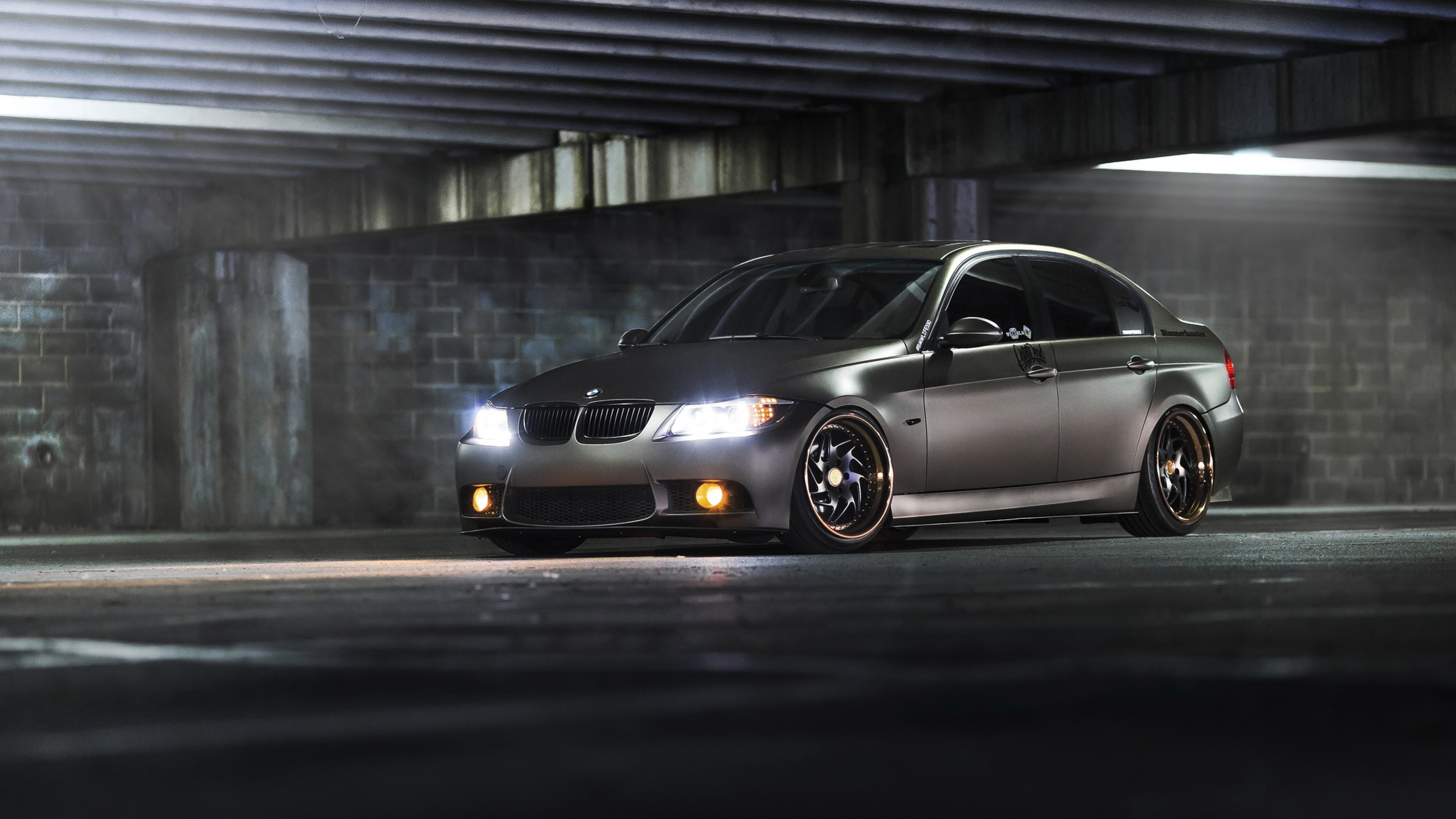 Description: A silver car parked in a parking garage next to a brick wall and a light on the front of it.