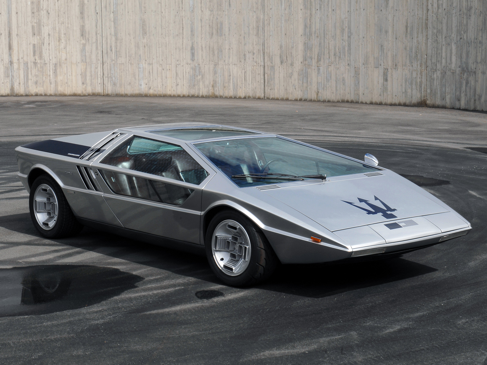 Description: A silver car parked in a parking lot next to a wall and a cement wall behind it with a person standing in the car.