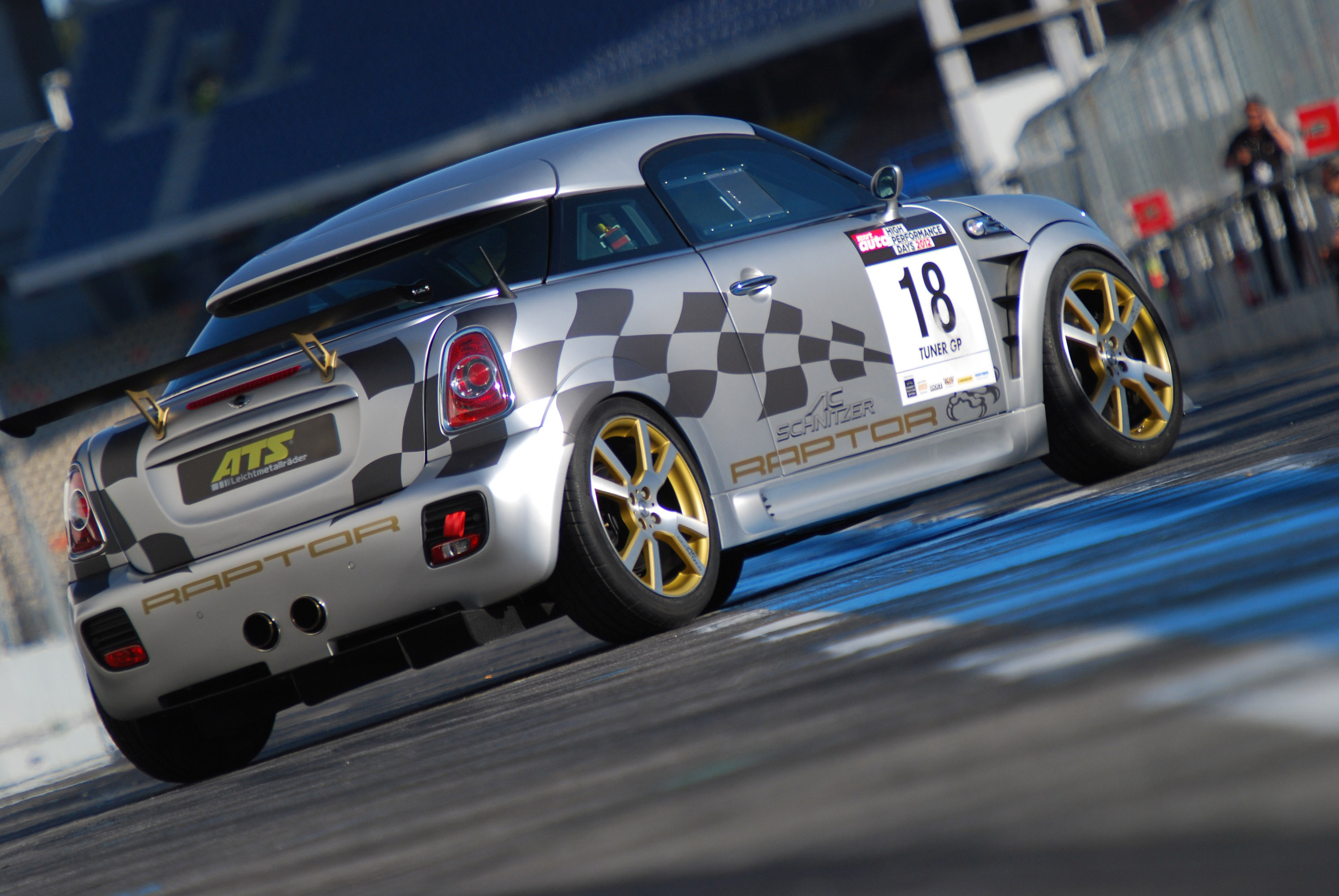 Description: A silver car driving down a race track with a number on it's side and a number on the back of the car.