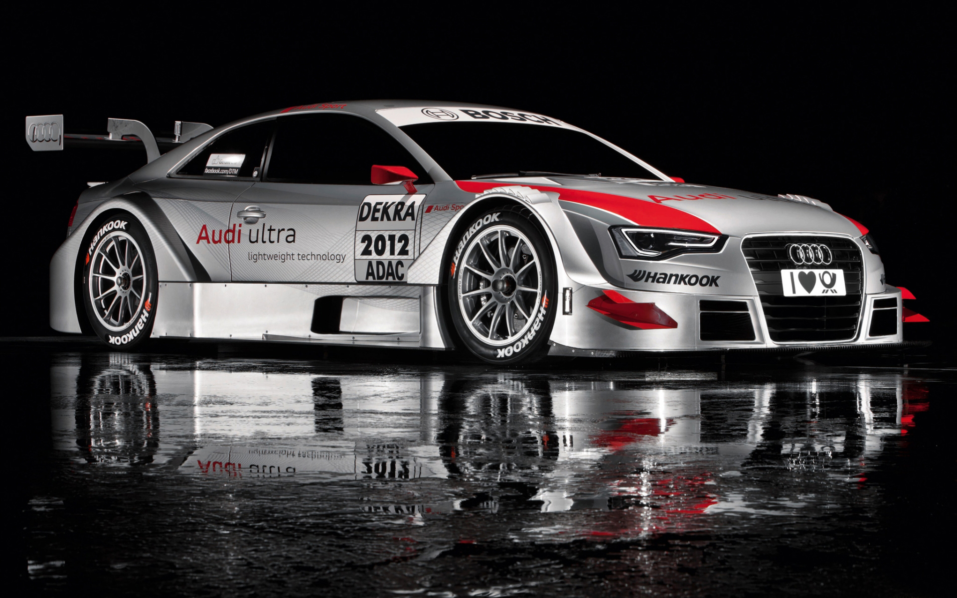 Description: A silver car with red stripes on it's side in a dark room with reflective flooring and a black background.