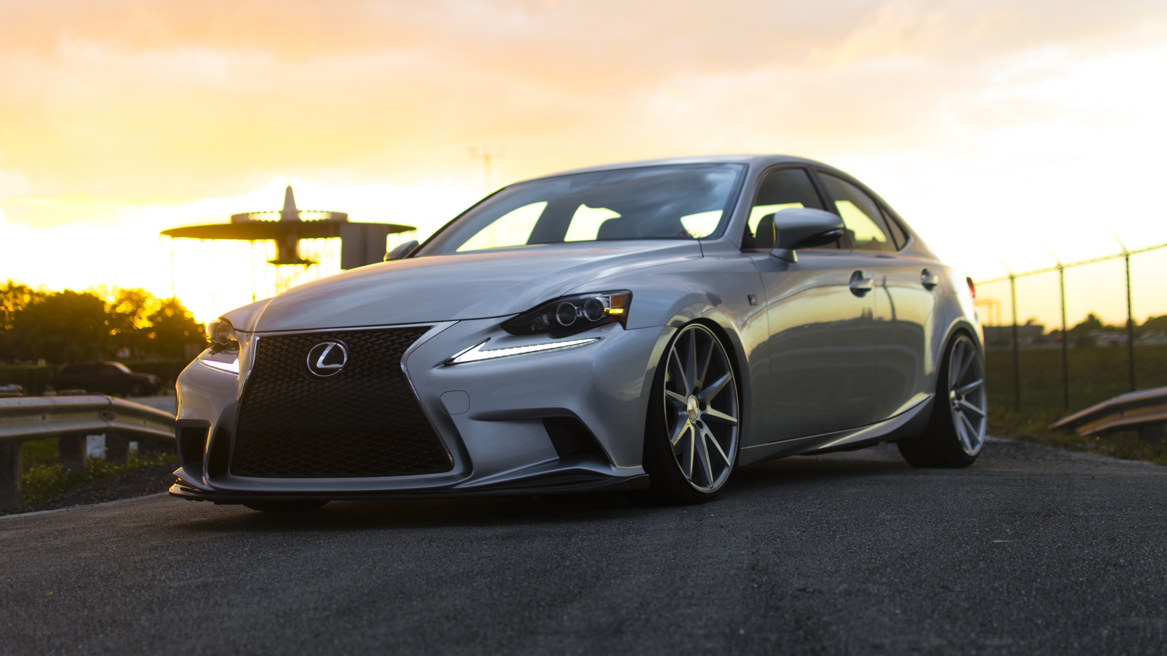 Description: A silver car parked on the side of a road near a fence and a plane in the background at sunset.