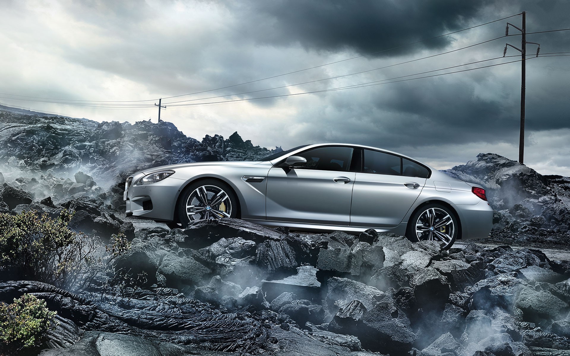 Description: A silver car is parked on a rocky road with a dark sky in the background and clouds in the sky.