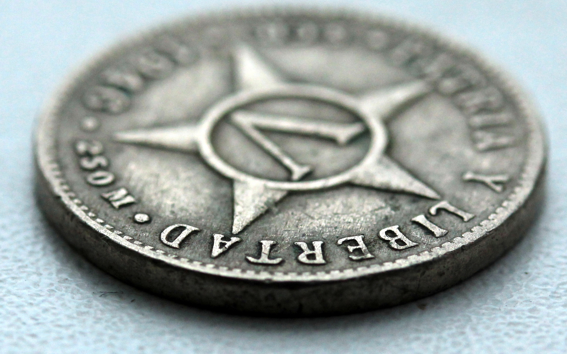 Description: A silver coin with a star on it sitting on a table top with a blue background and a white background.
