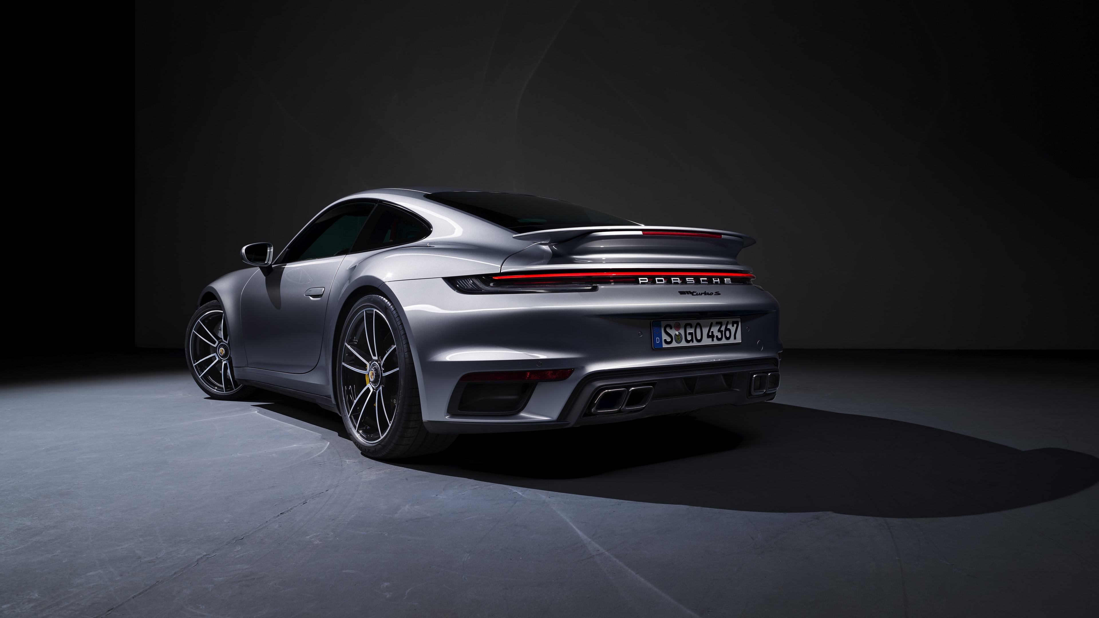 Description: A silver porsche sports car in a dark room with a black background and a spotlight on the back of the car.