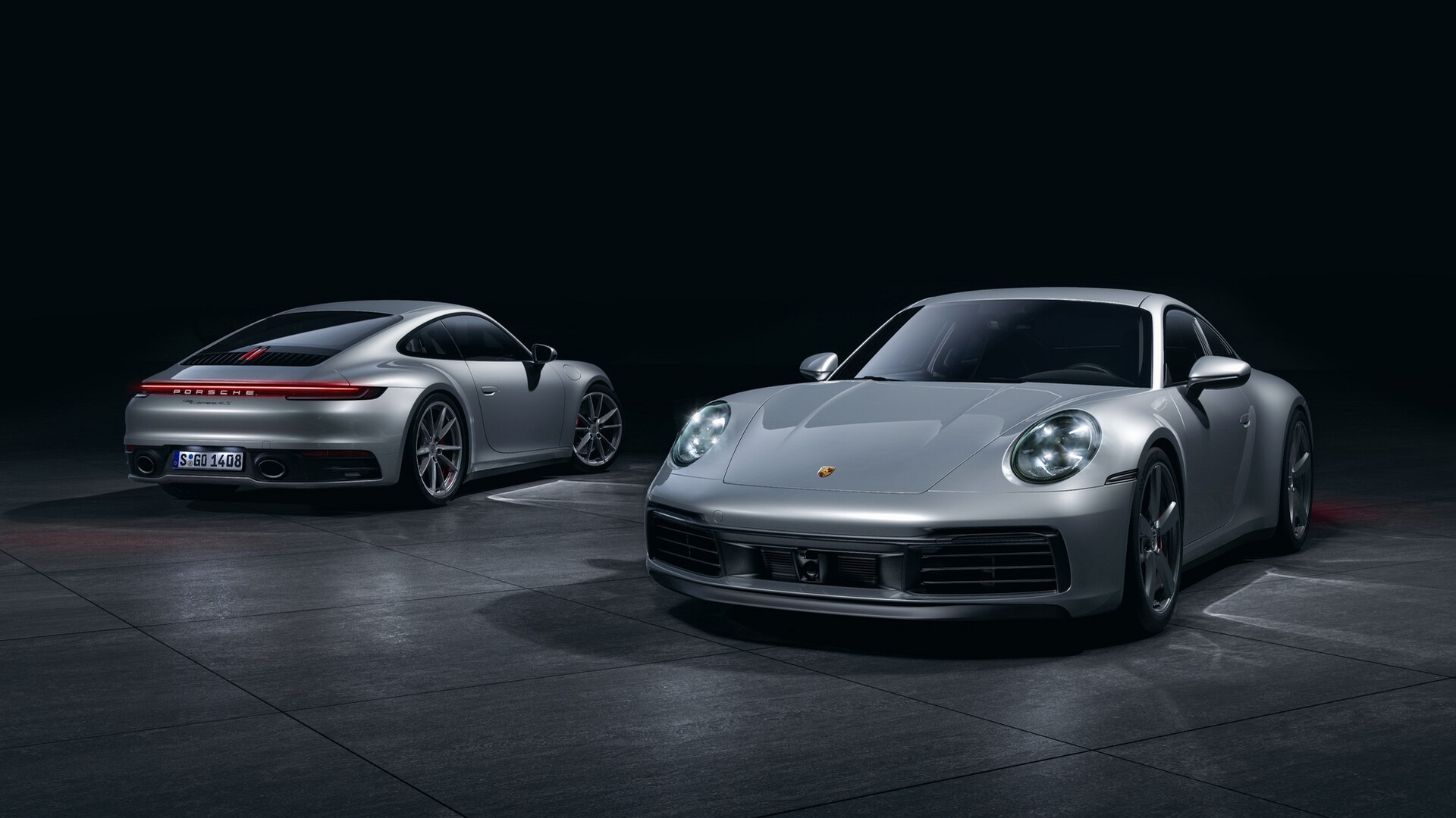 Description: Two silver porsches are shown in a dark room with a black background and a black background with a white background.