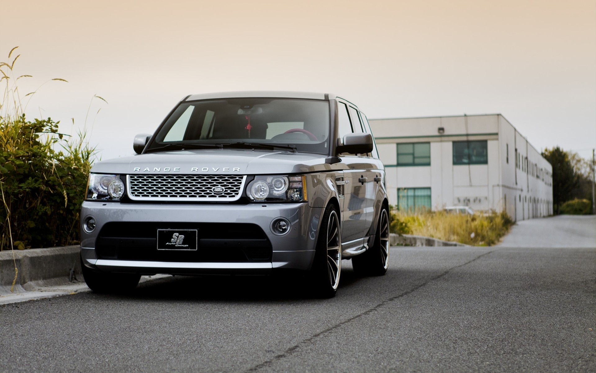 Description: A silver range rover parked in front of a building on a street with a parking meter in front of it.
