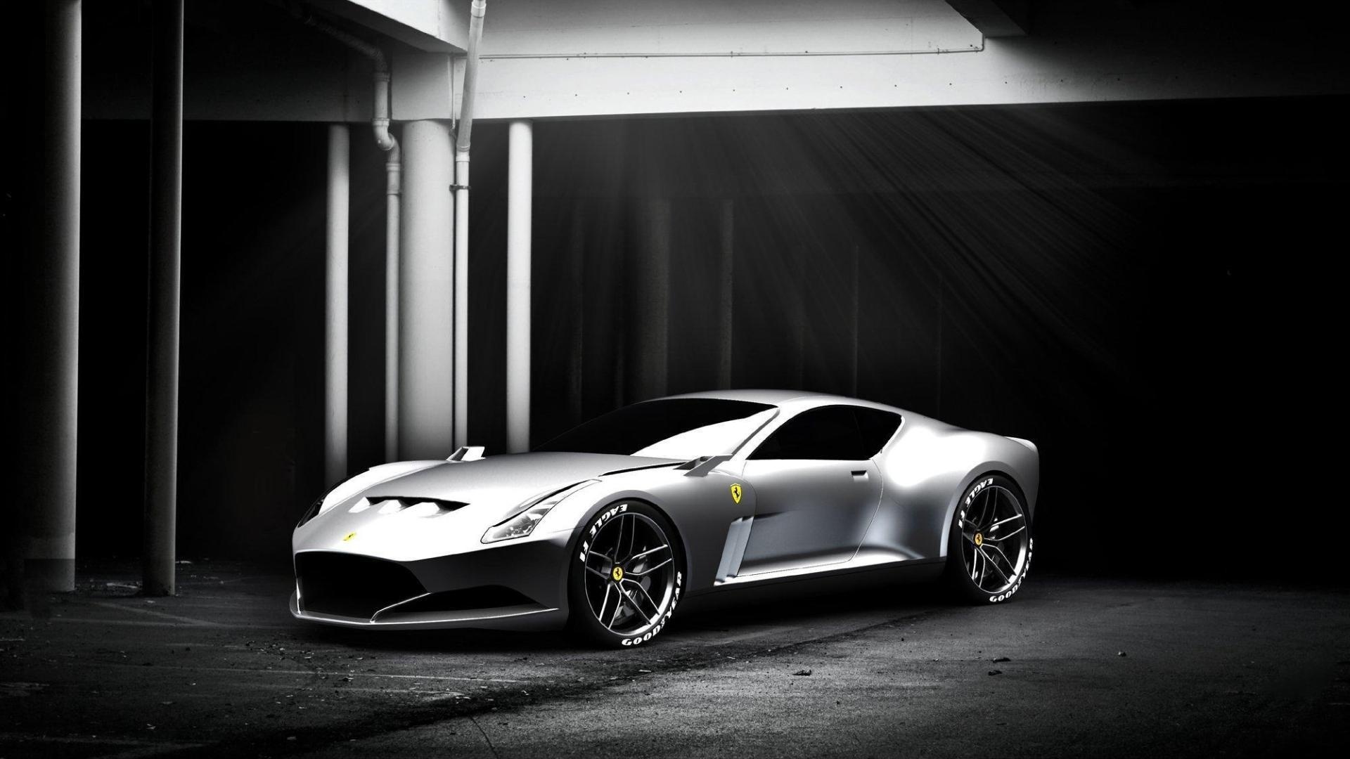Description: A silver sports car parked in a dark garage with a spotlight on the wall behind it and a black curtain.