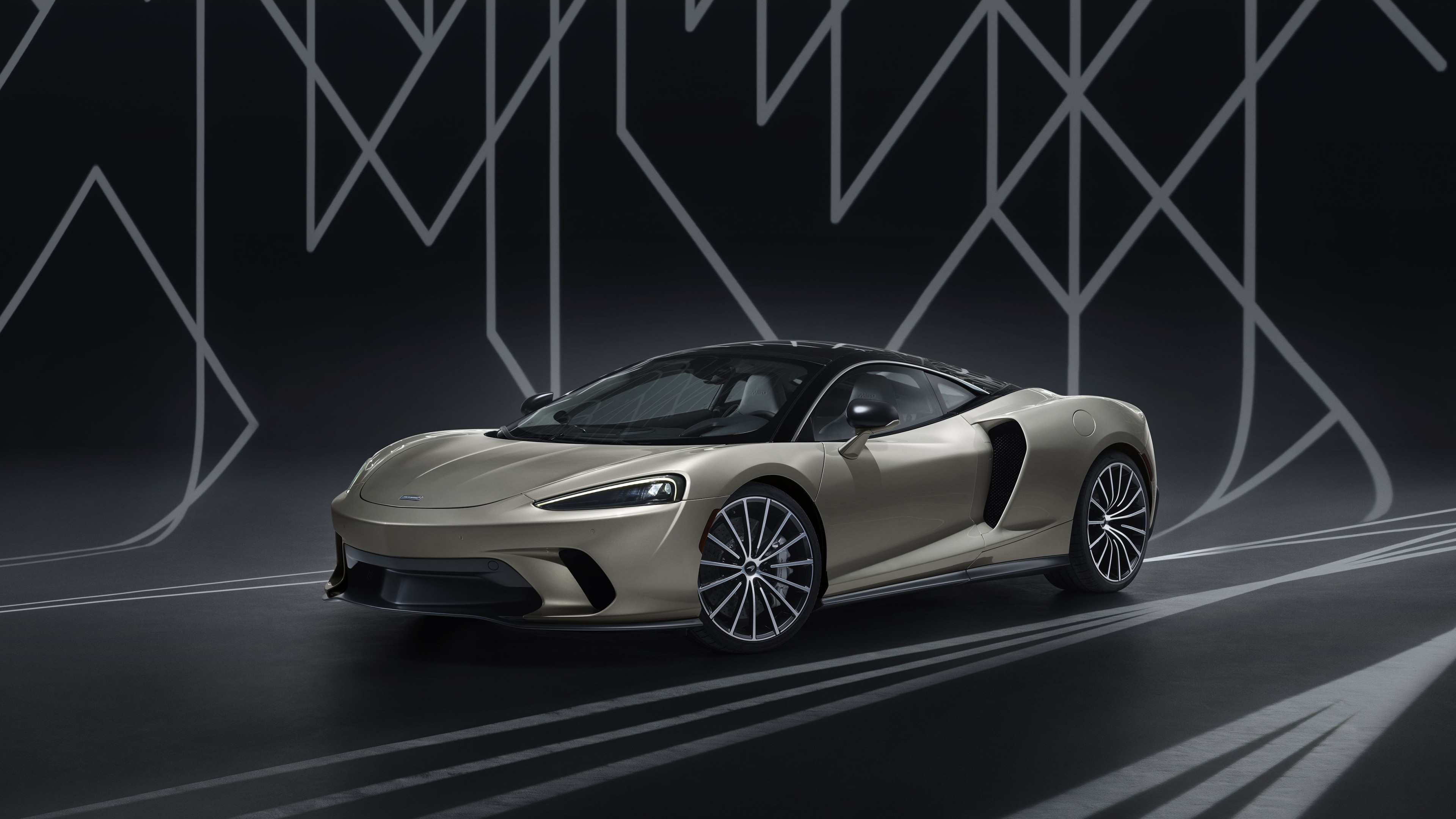 Description: A silver sports car is shown in a dark room with a pattern on the wall behind it and a black background.