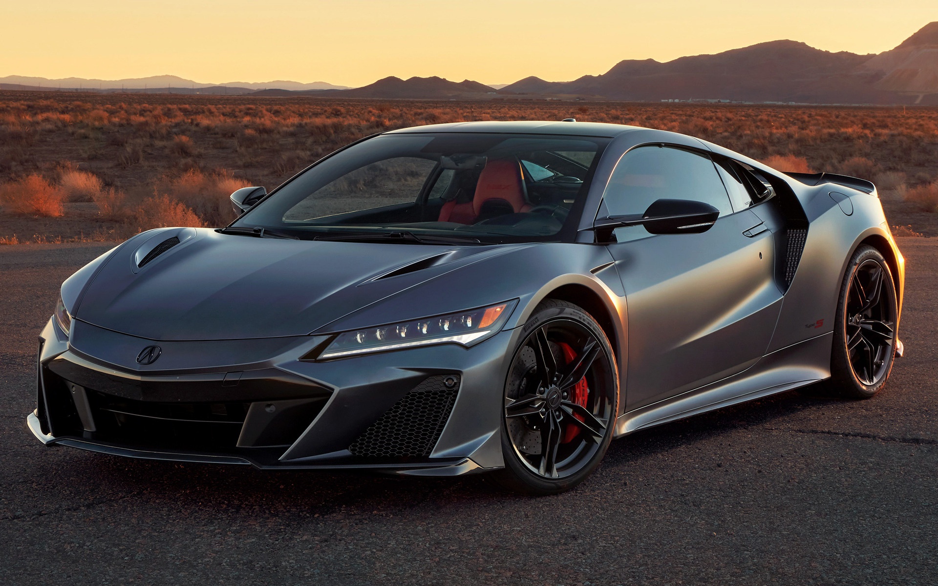 Description: A silver sports car parked in a desert area at sunset with mountains in the background and a red seat.