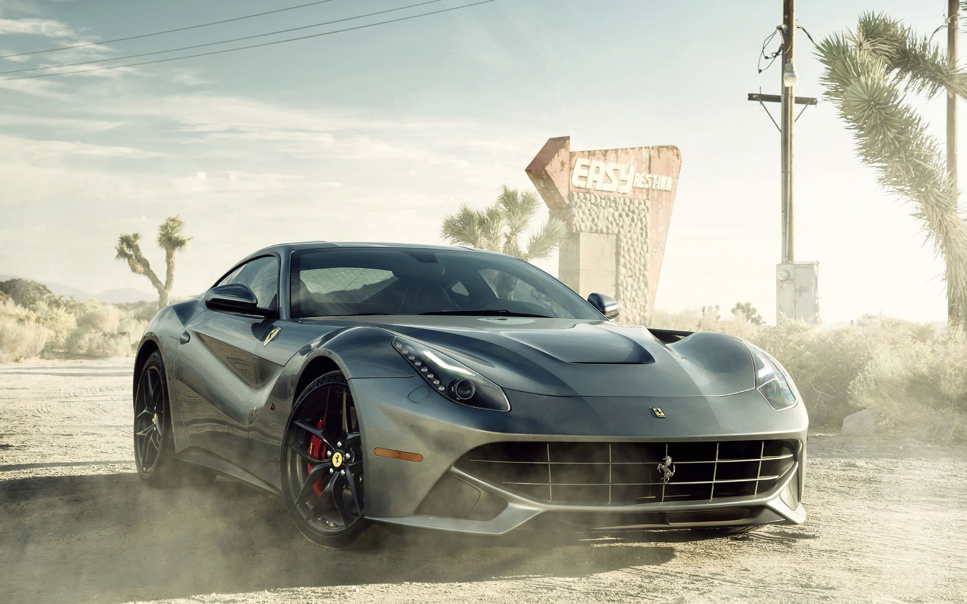 Description: A silver sports car driving down a dirt road next to a palm tree and a sign that says welcome to the city.