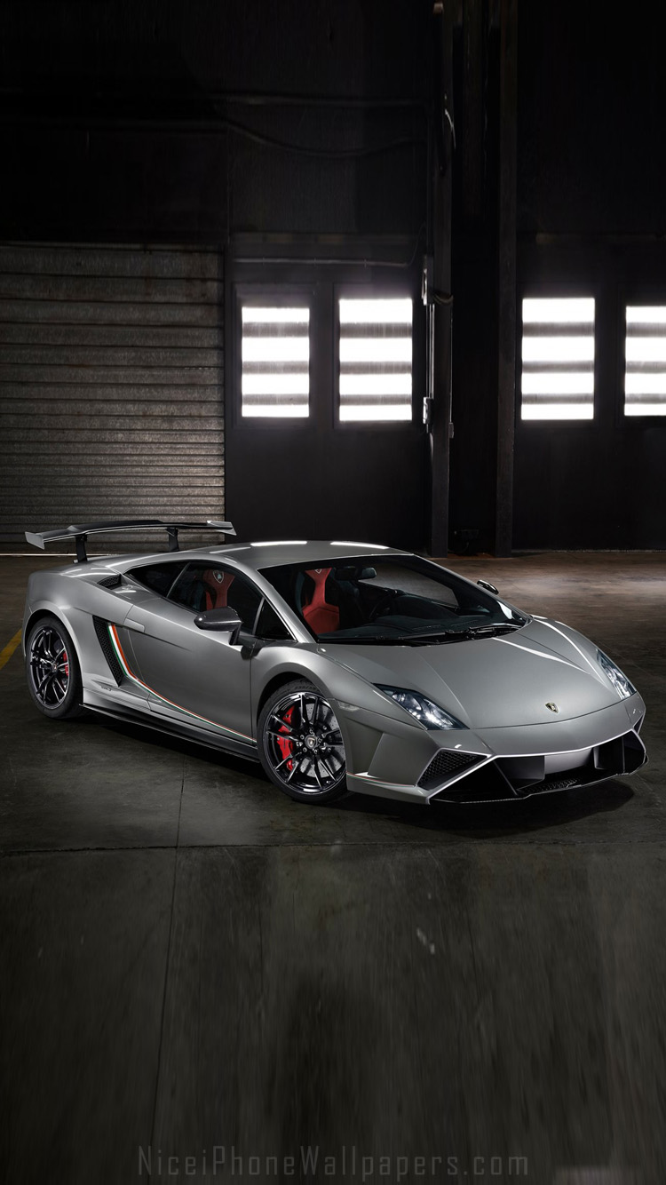 Description: A silver sports car parked in a garage with a red door and a black floor and a black garage door.