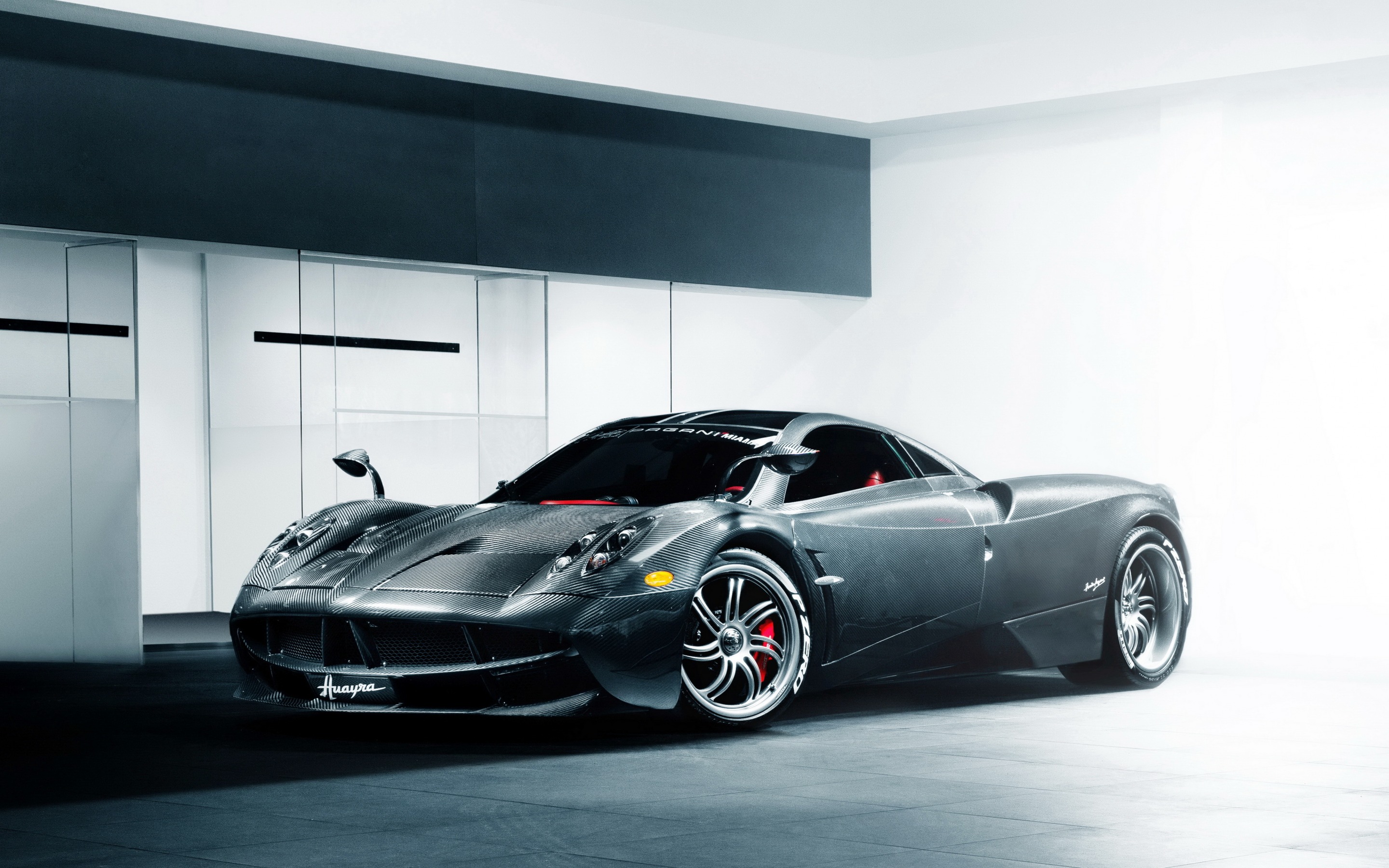 Description: A silver sports car parked in a garage next to a white wall and a white door with a black door.