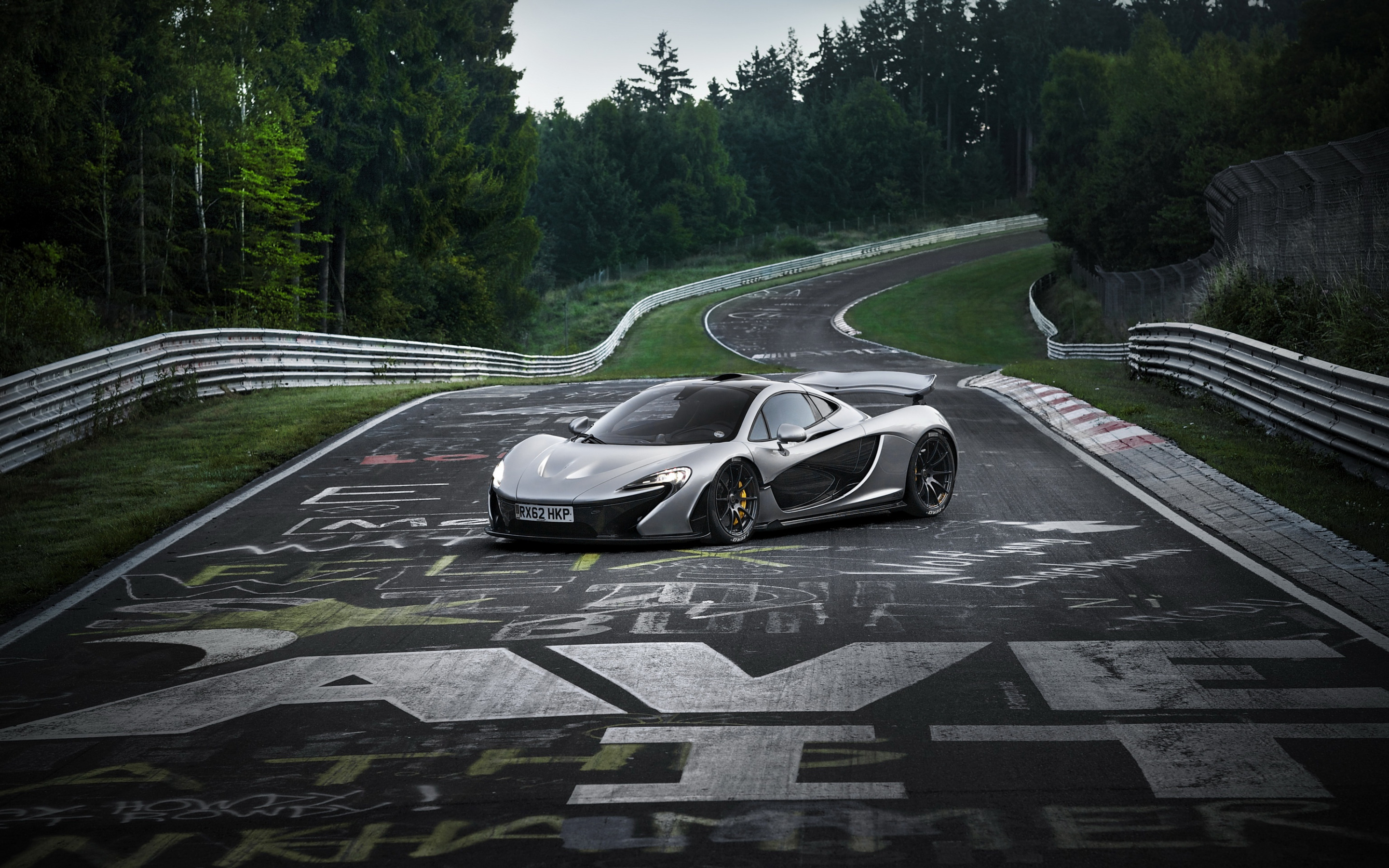 Description: A silver sports car driving down a road with graffiti on it's side and trees in the background.