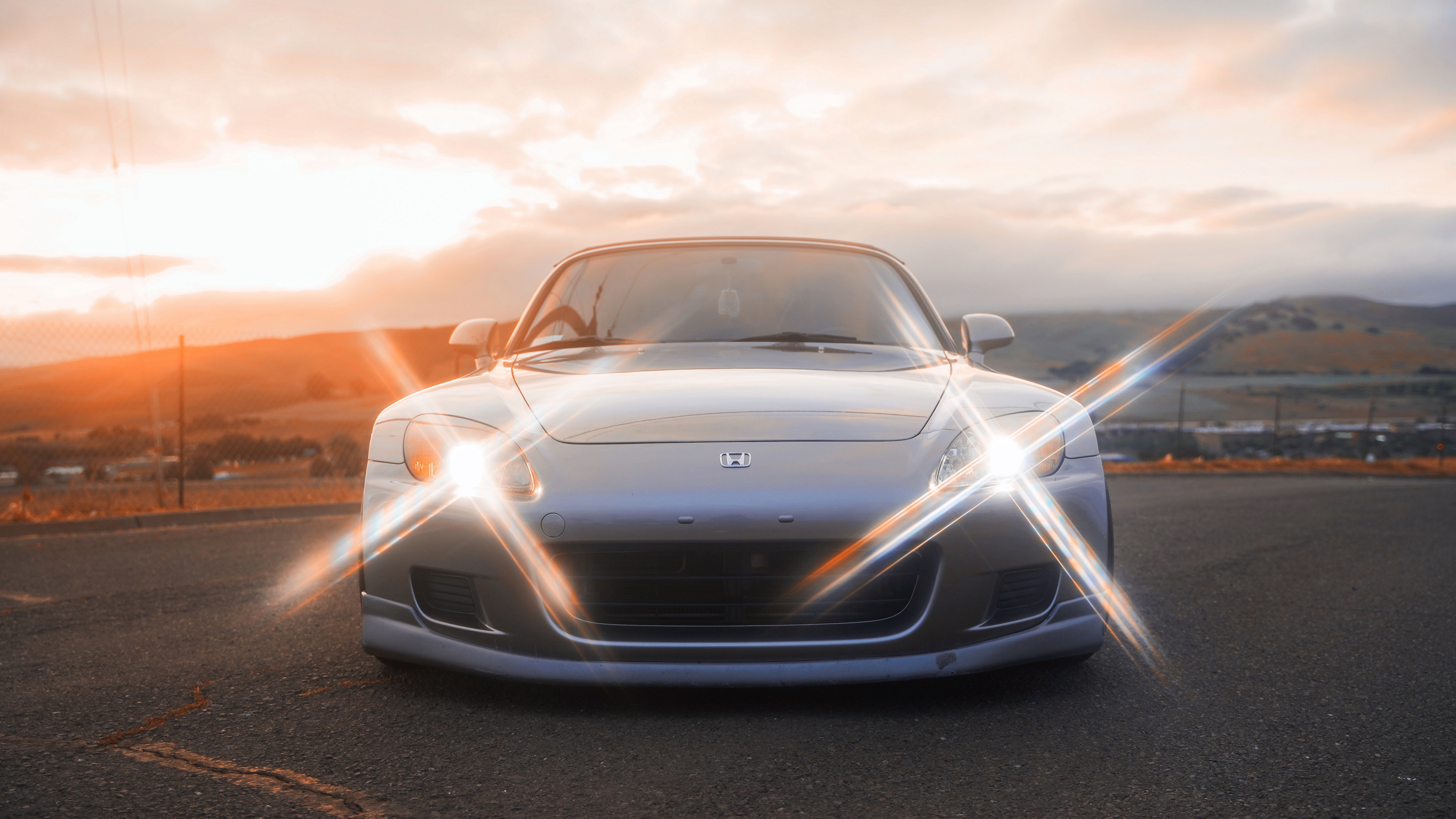 Description: A silver sports car driving down a road with the sun shining through the clouds behind it and a mountain in the background.