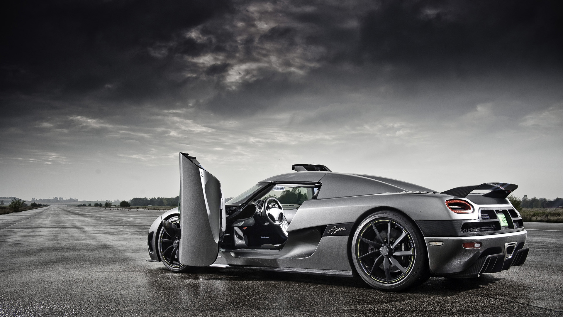 Description: A silver sports car with its doors open on a road with dark clouds in the background and a parking lot.