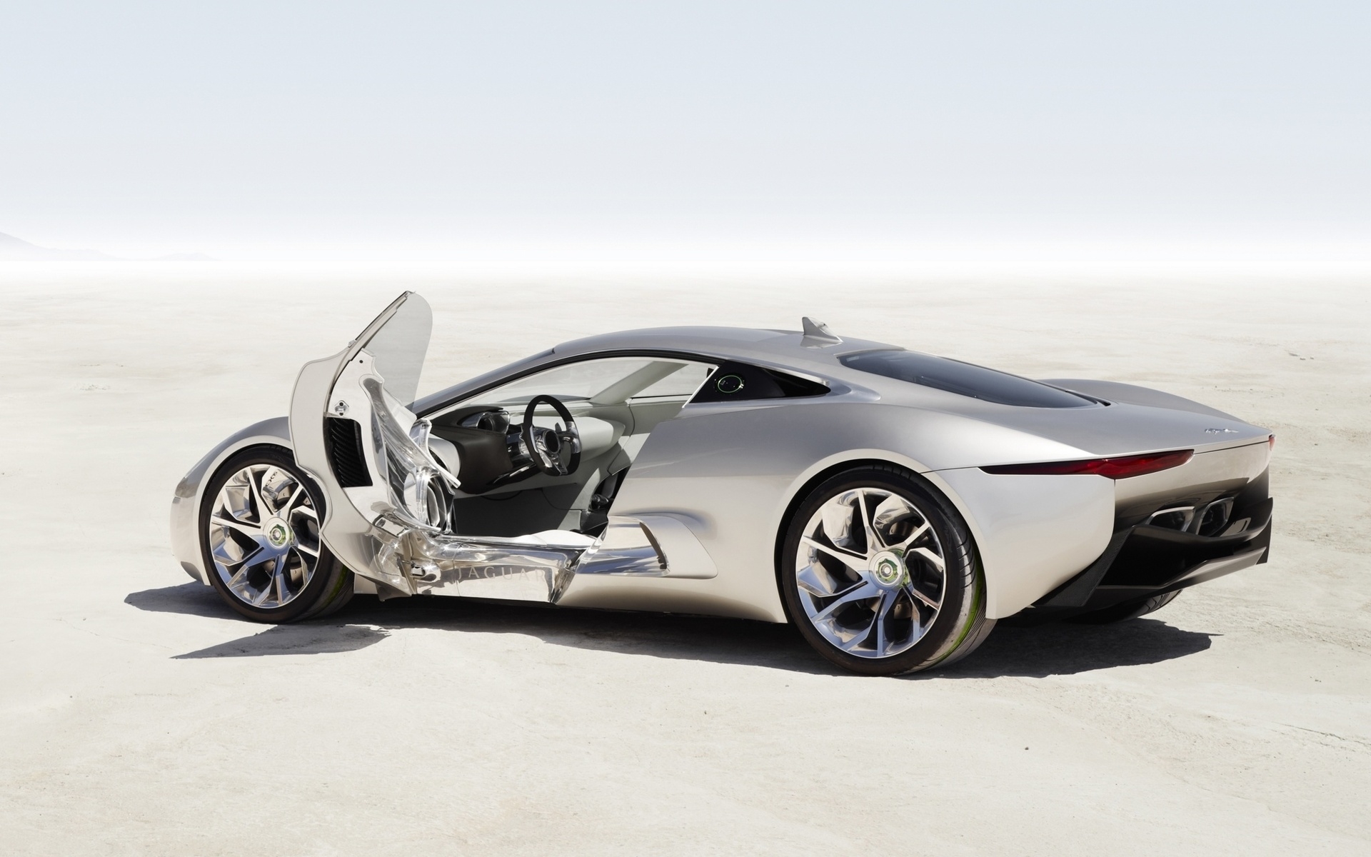 Description: A silver sports car with its doors open on a desert plain with a sky background and a few clouds.