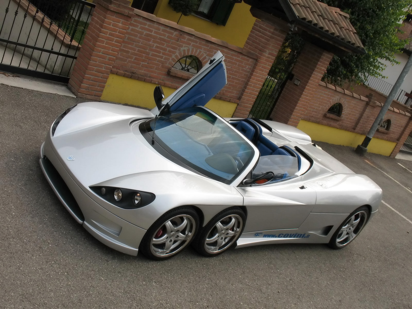 Description: A silver sports car parked in a parking lot with its open hood up and the door open on the top.