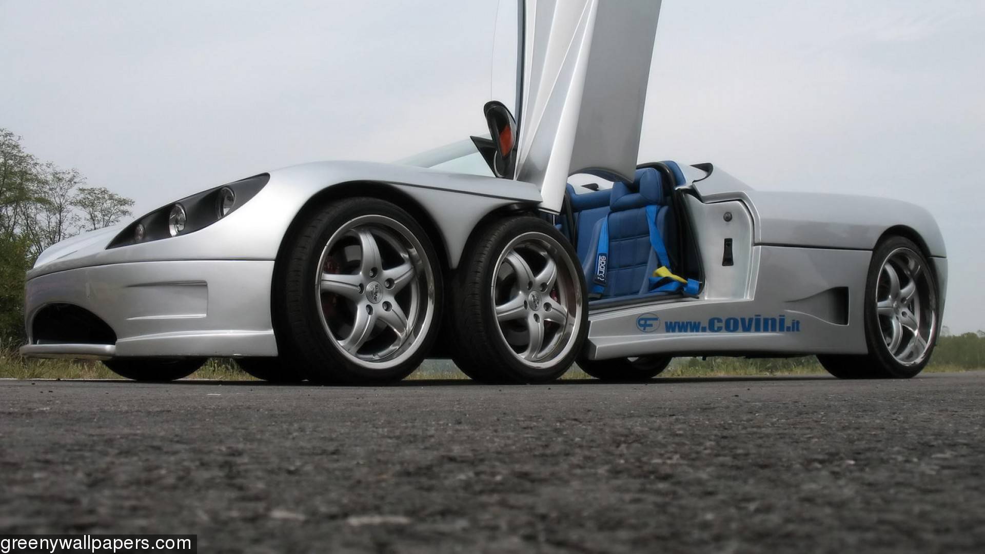 Description: A silver sports car with its doors open on the road with trees in the background and a sky background.