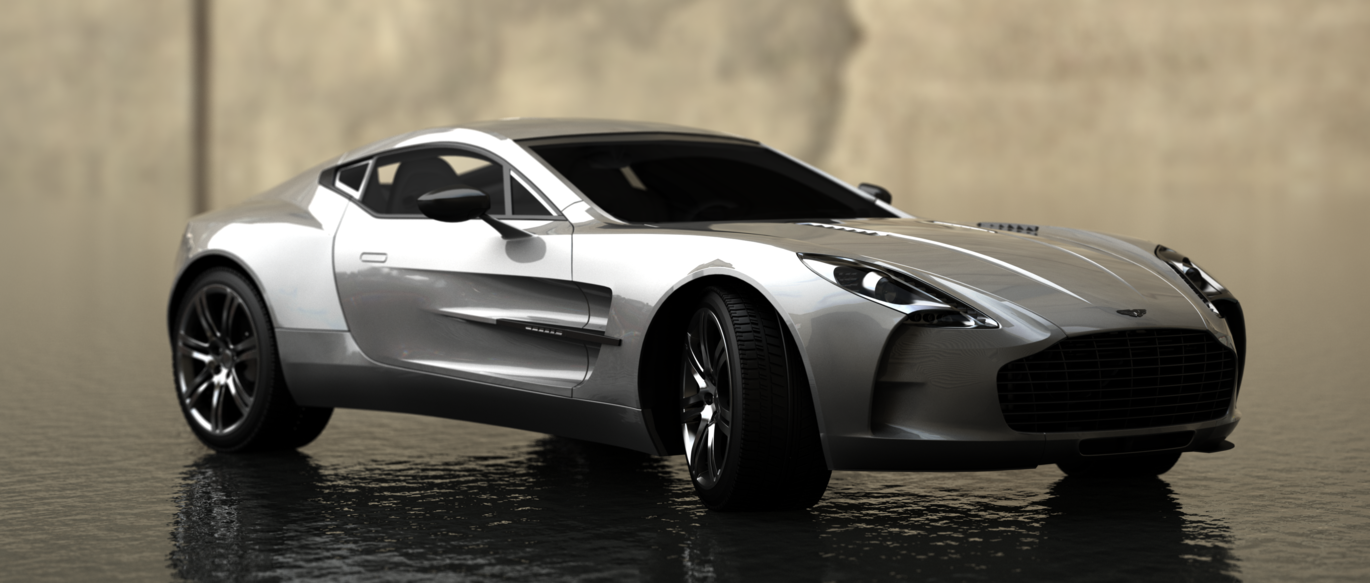 Description: A silver sports car on a reflective surface with a wall in the background and a reflection of the car.