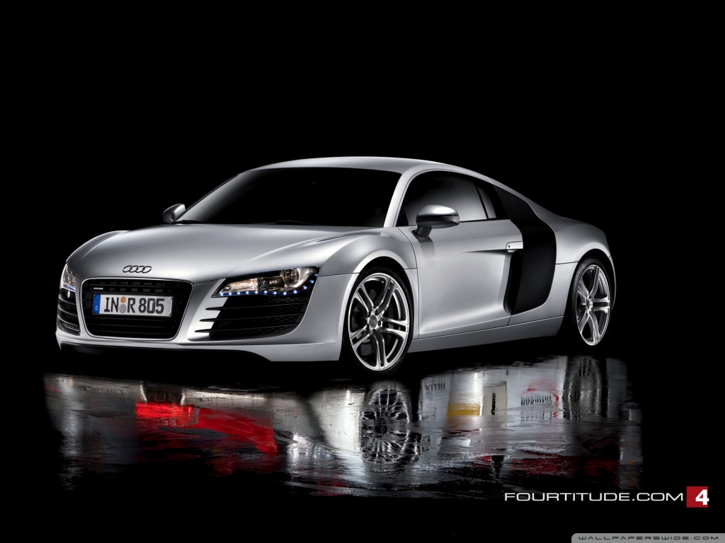 Description: A silver sports car is shown in a dark room with a reflective floor and a black background with a red light.