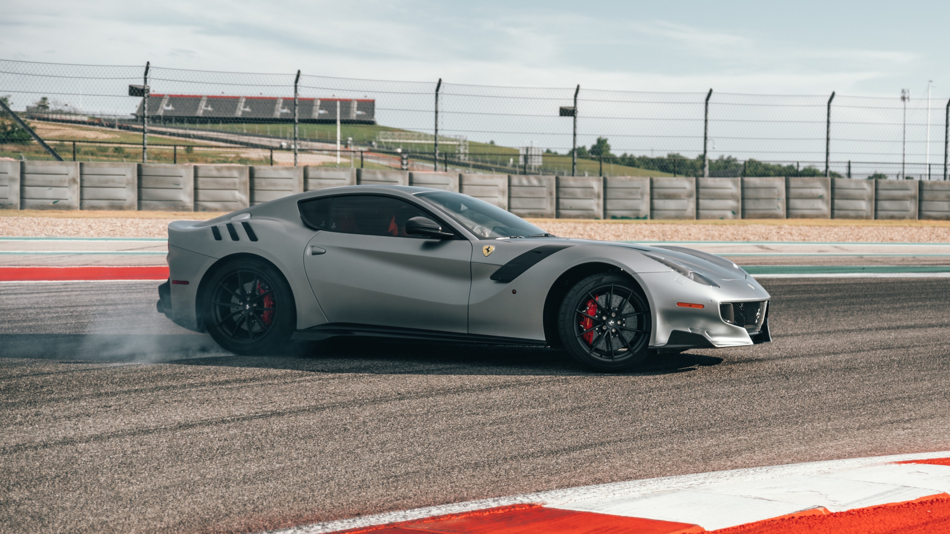 Description: A silver sports car driving on a race track with smoke coming out of the tires and the front wheel.