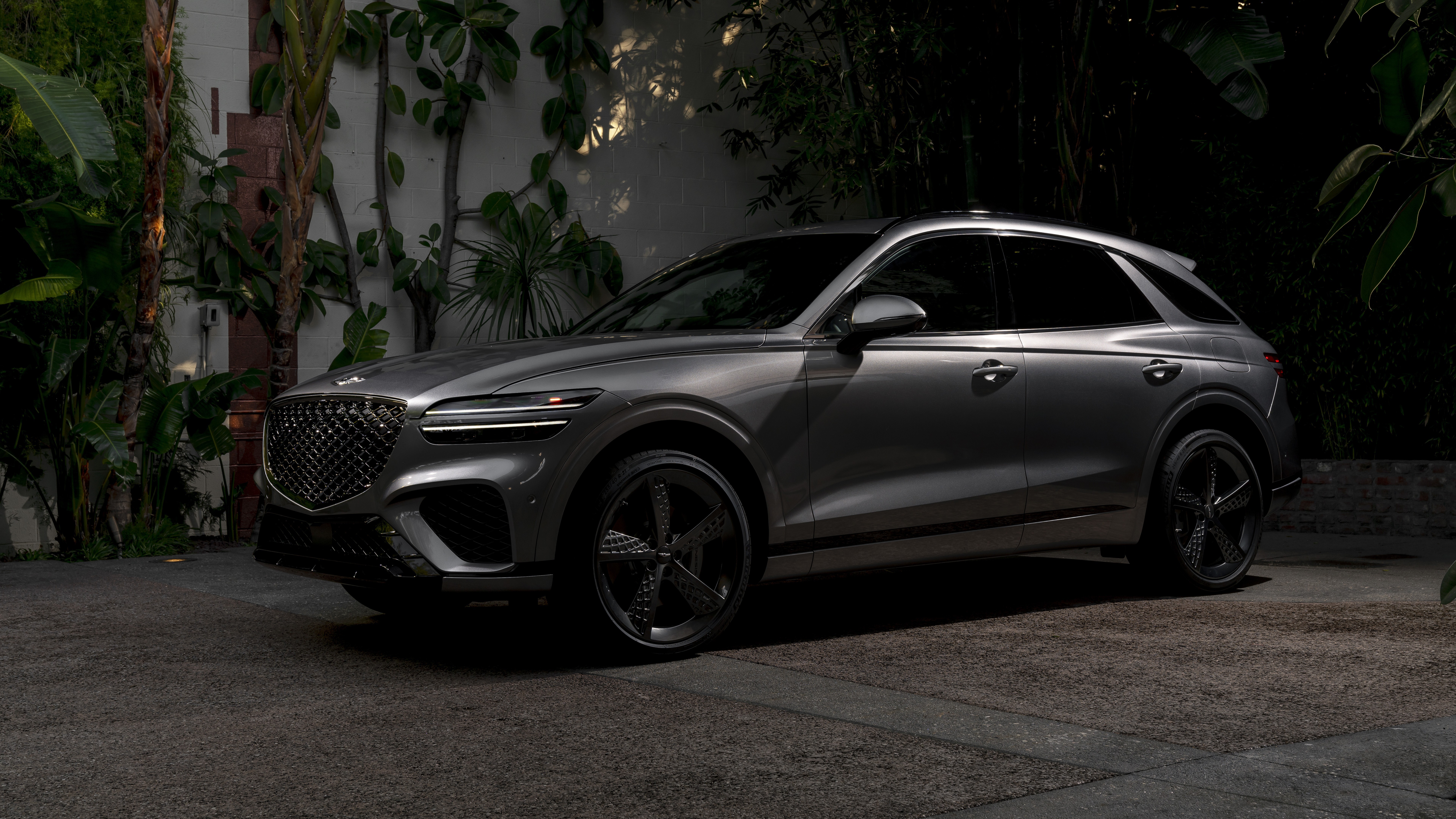Description: A silver suv parked in front of a house at night with a plant behind it and a wall of greenery behind it.