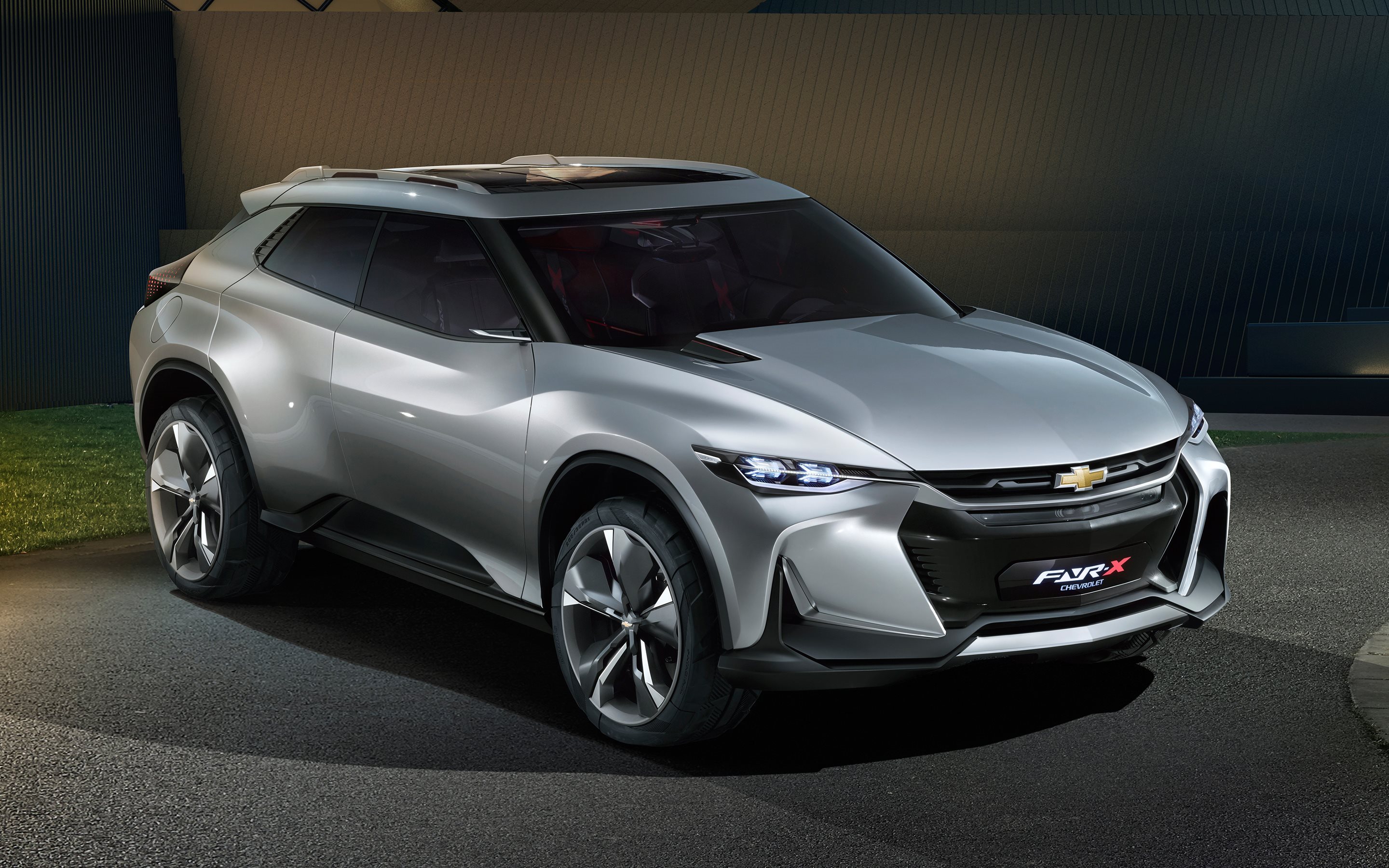 Description: A silver suv is parked in a parking lot at night time with a clock on the wall behind it.