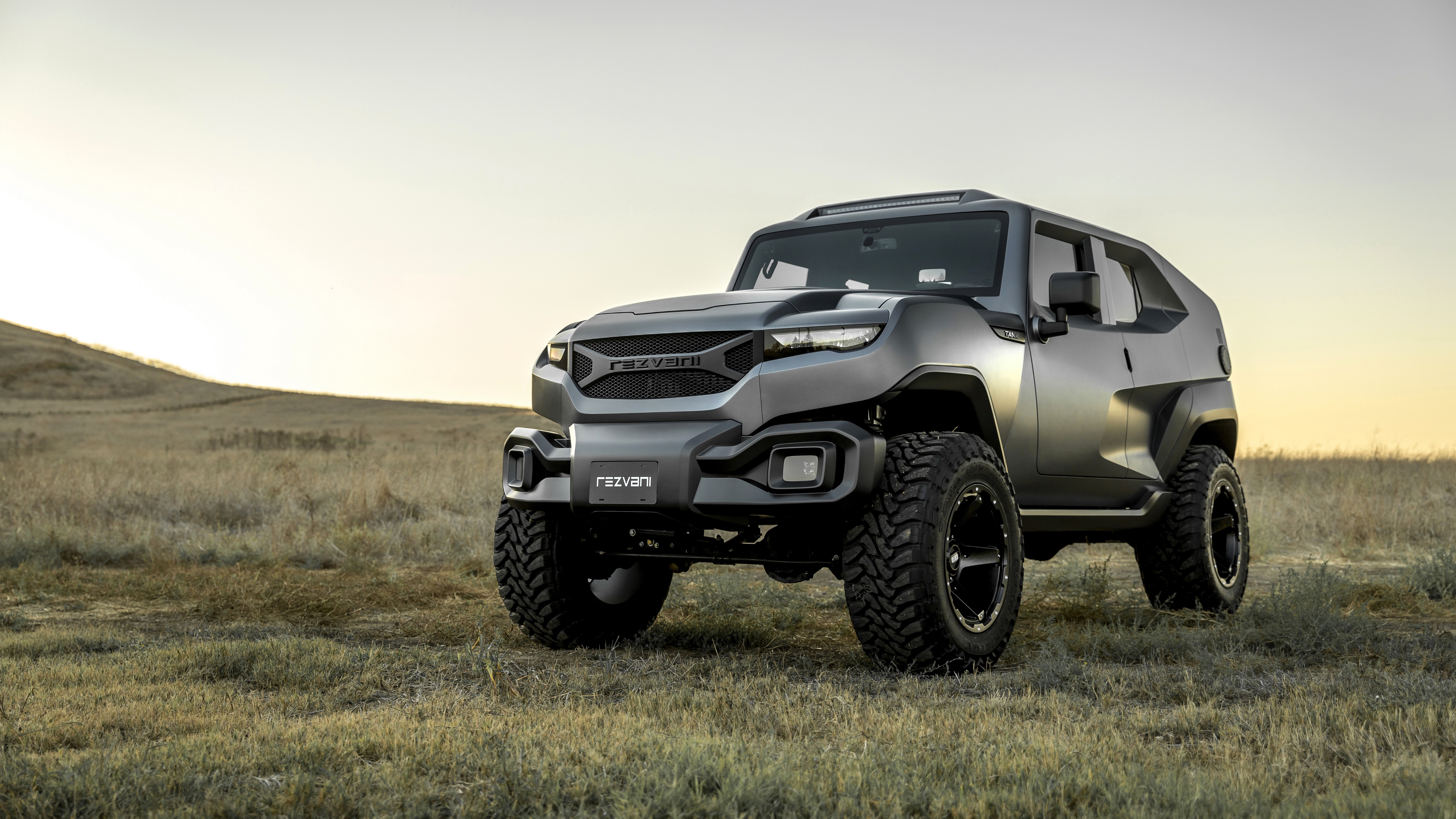 Description: A silver truck parked in a field of grass with a sky background and a hill in the background with a few clouds.