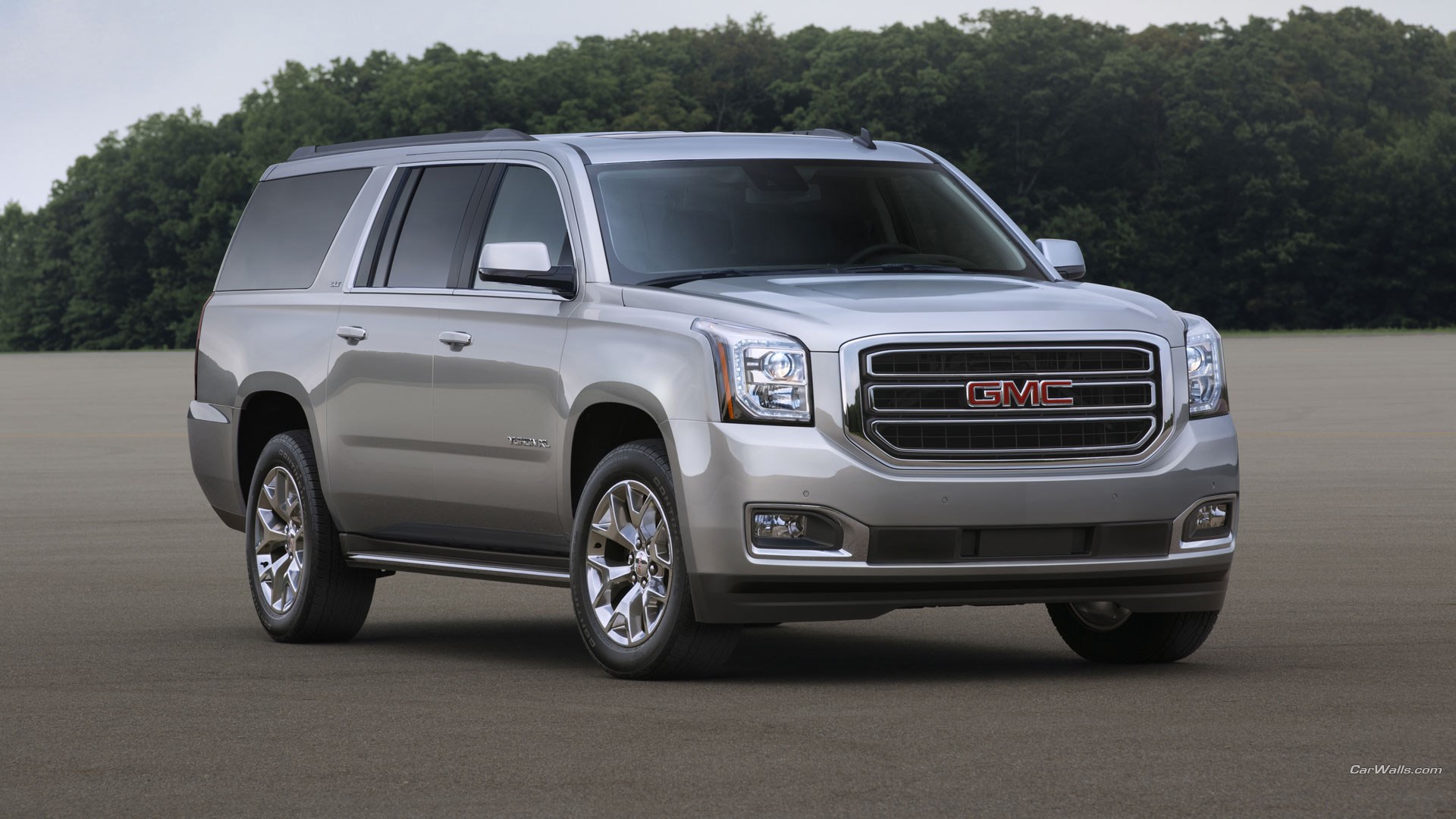 Description: A silver truck parked in a parking lot next to trees and bushes on a cloudy day with a sky background.