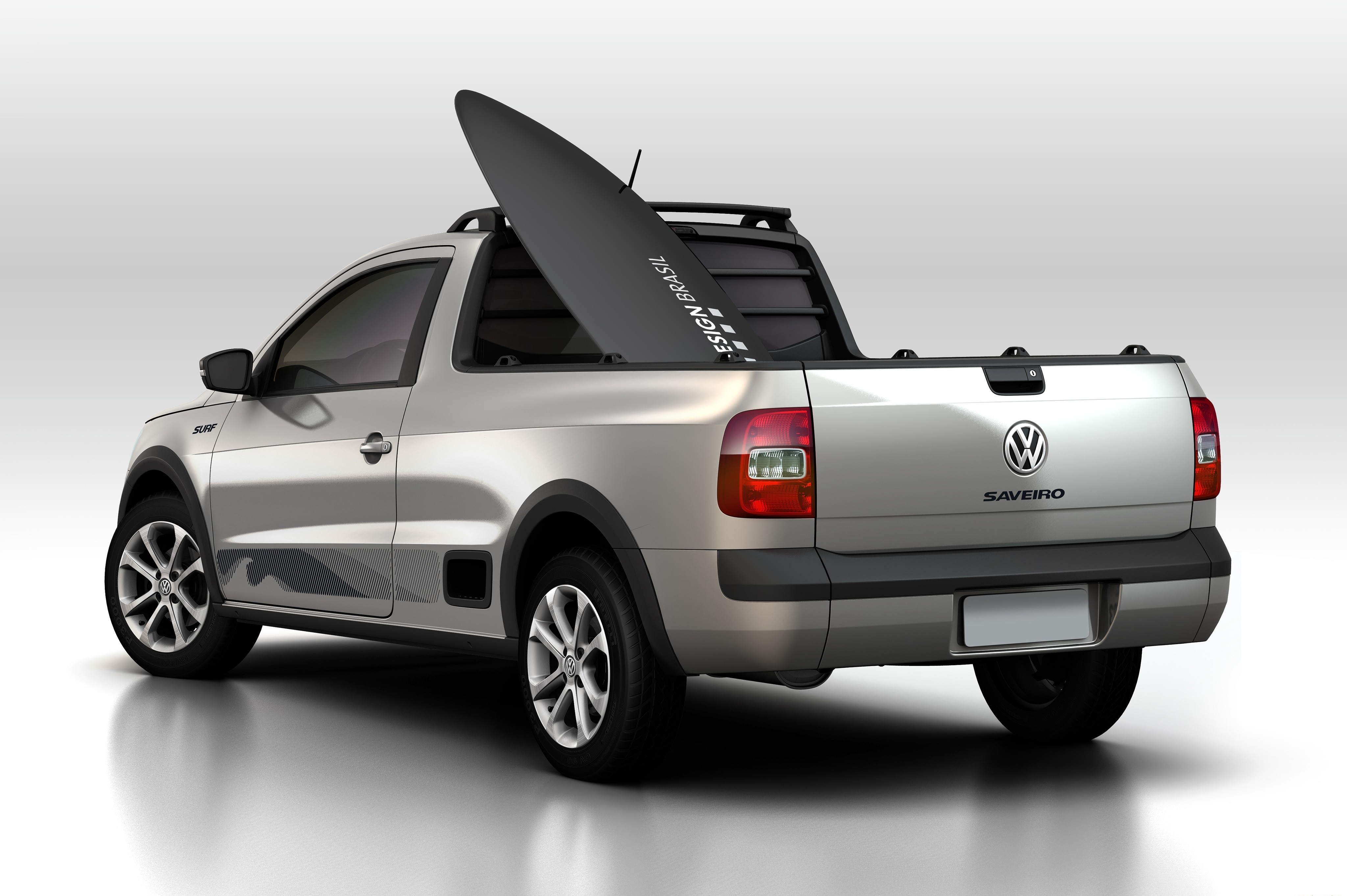 Description: A silver truck with a surfboard on the back of it's bed and a surfboard on the back of the truck.