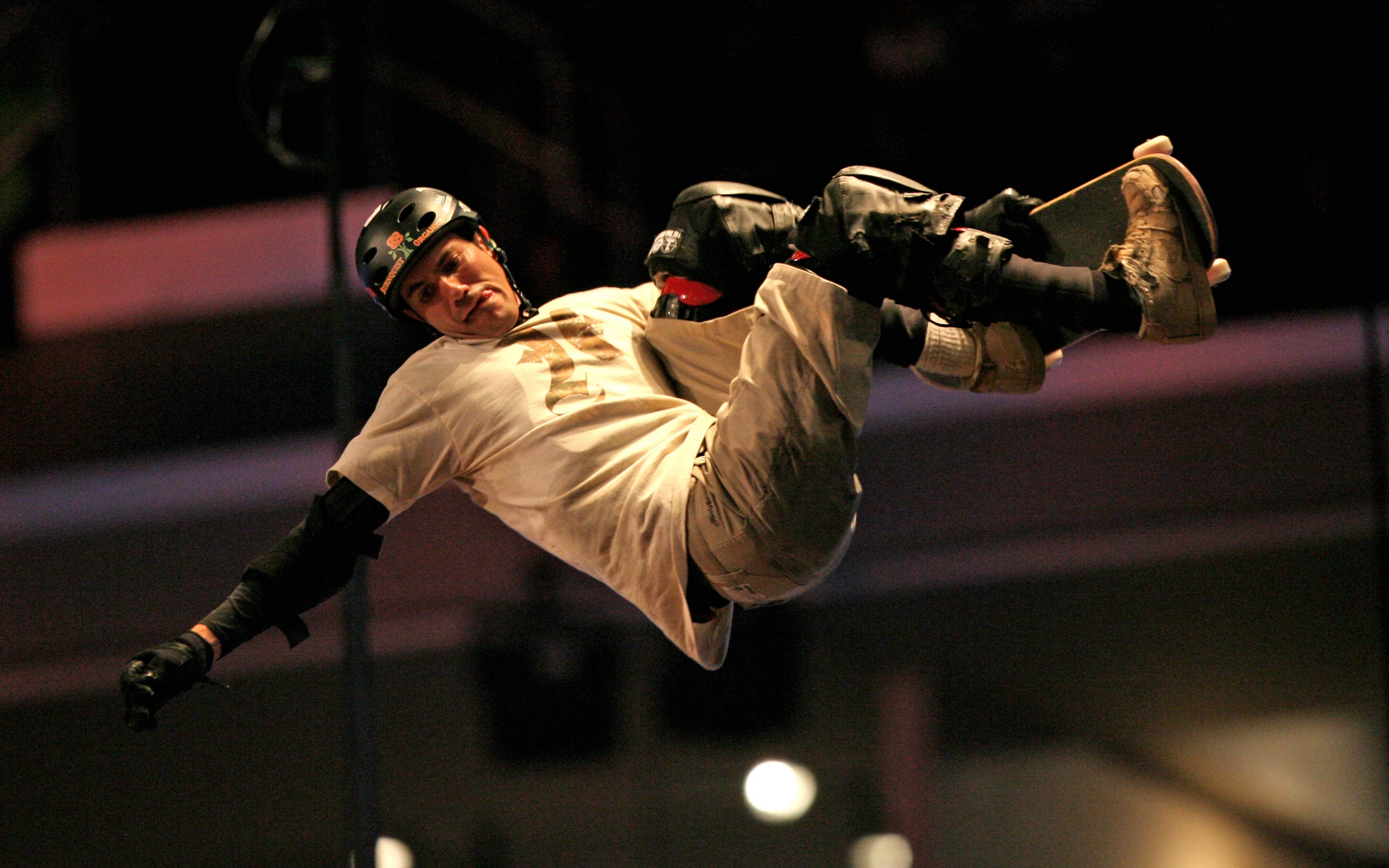 Description: A man in a white shirt doing a trick on a skateboard in the air with his feet in the air.