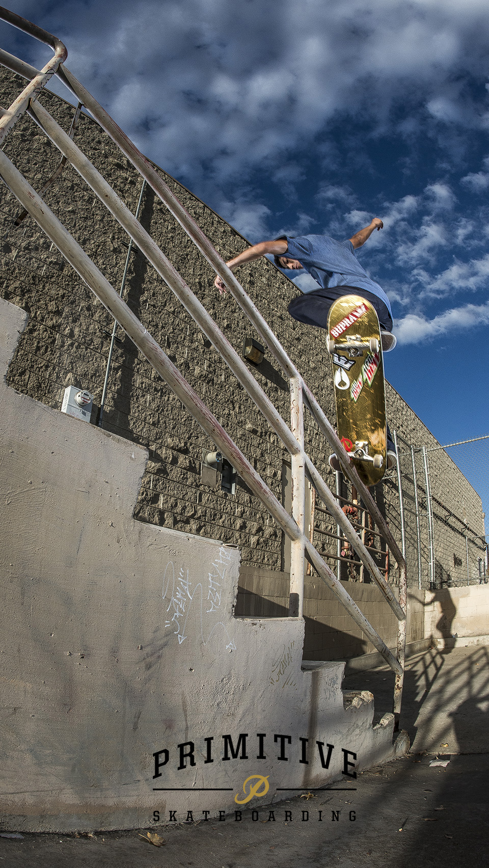 Description: A skateboarder is doing a trick on a rail outside a building with a sky background and a sign that says primitive skateboarding.