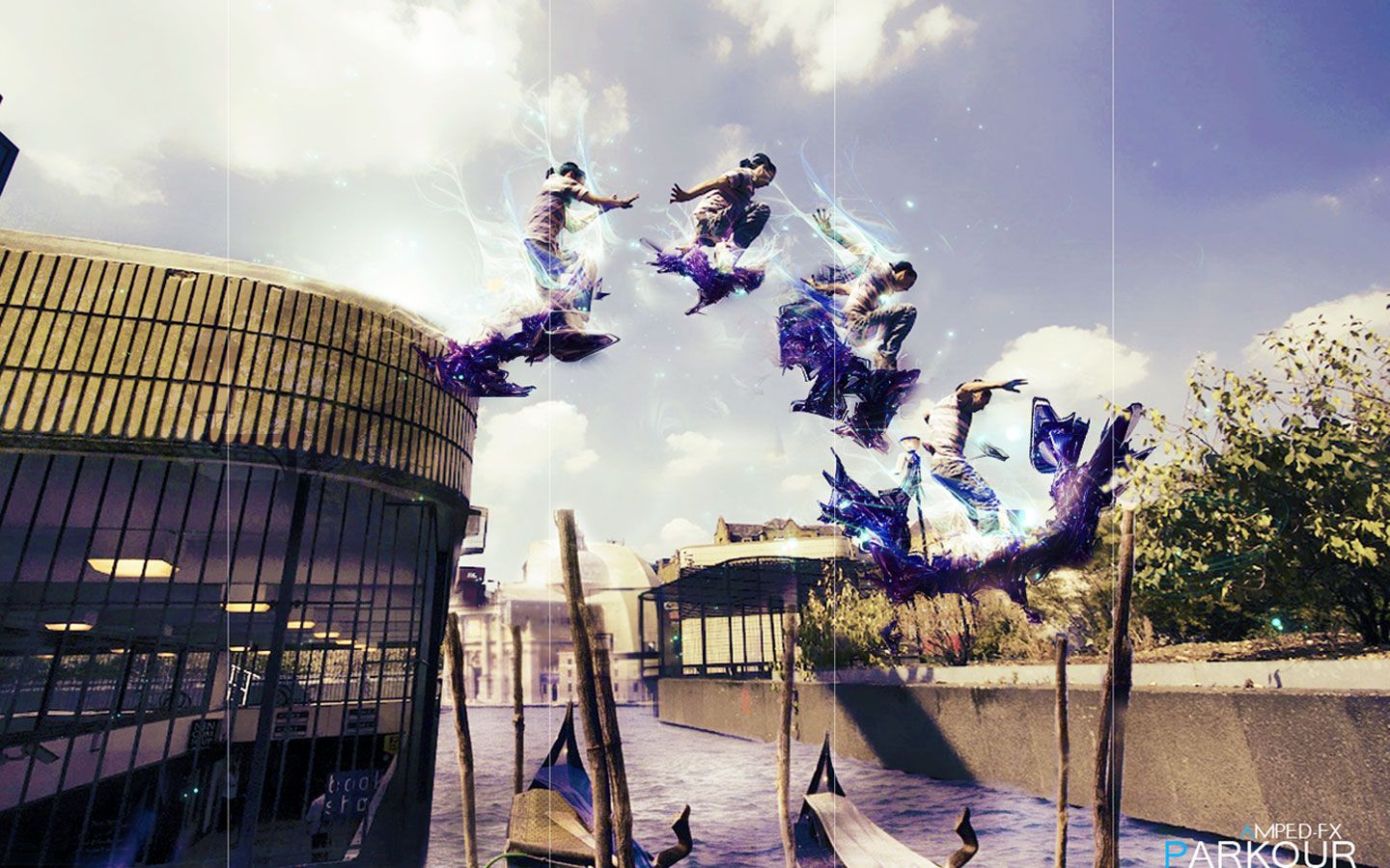 Description: A group of people riding skateboards on top of a bridge over water with a sky background and a building.