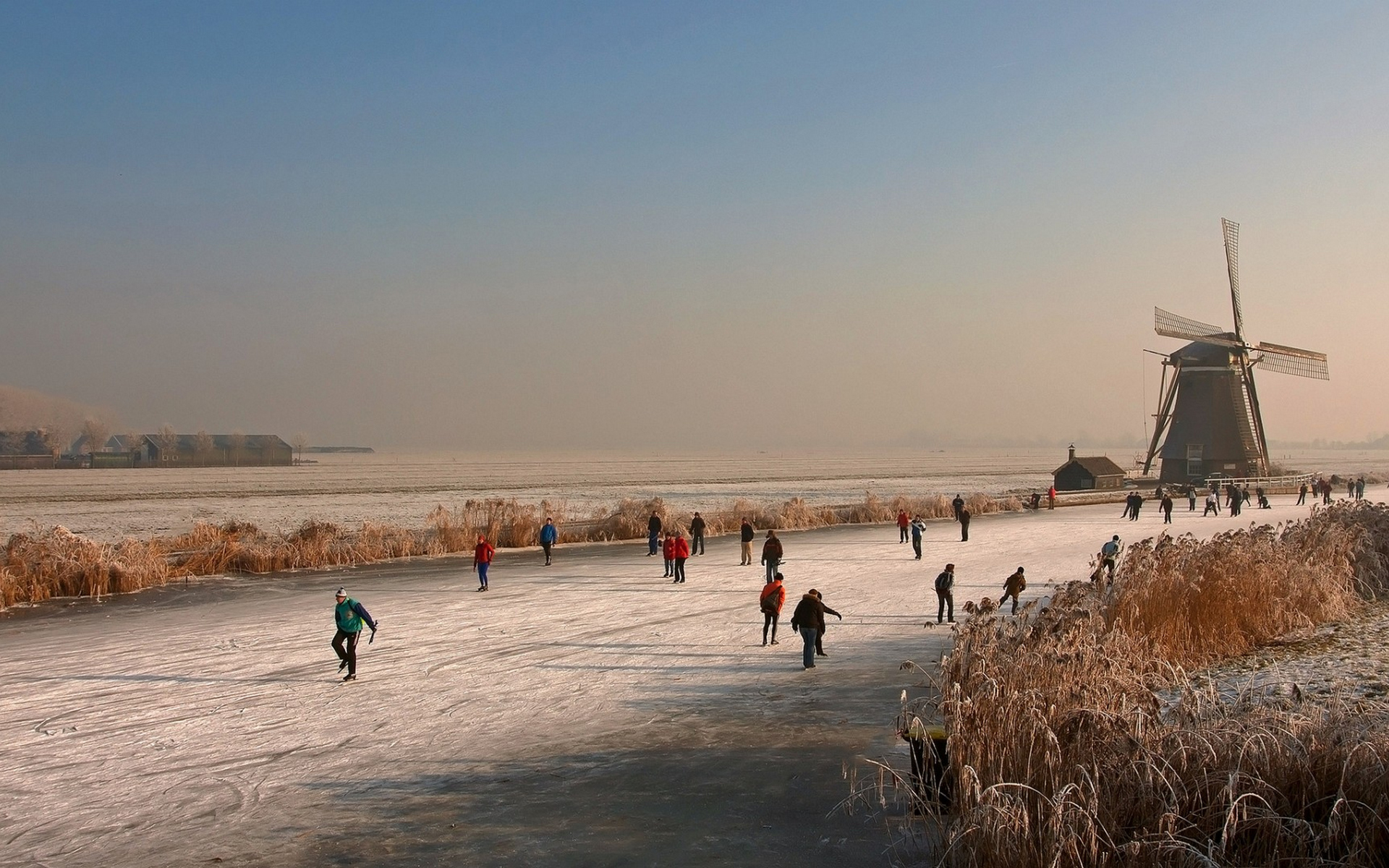 Description: A group of people skating on a frozen lake next to a windmill in the distance with a few people walking around.