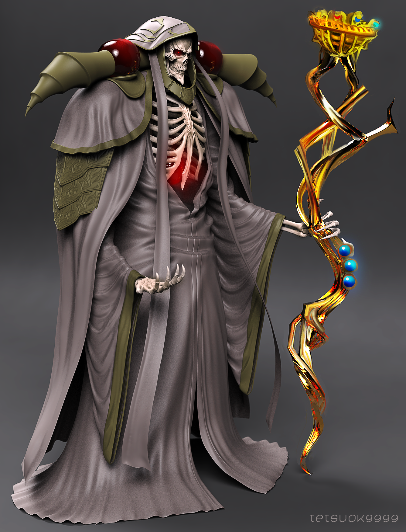 Description: A skeleton dressed in a costume holding a golden object in its hand and a spiral of fire coming out of it.